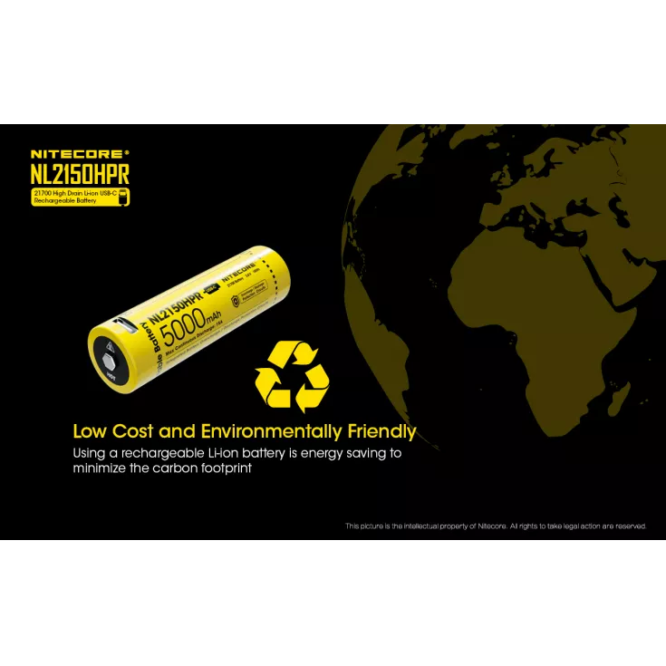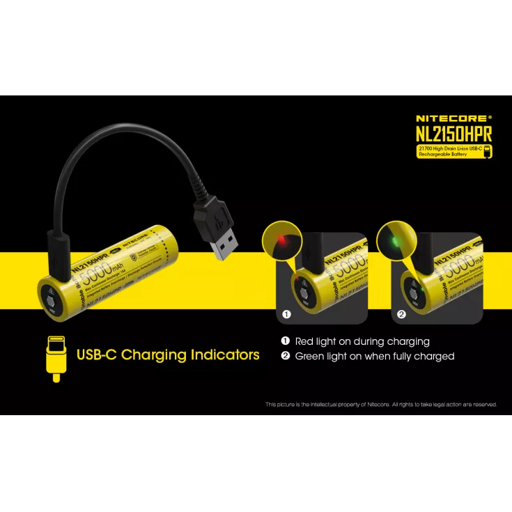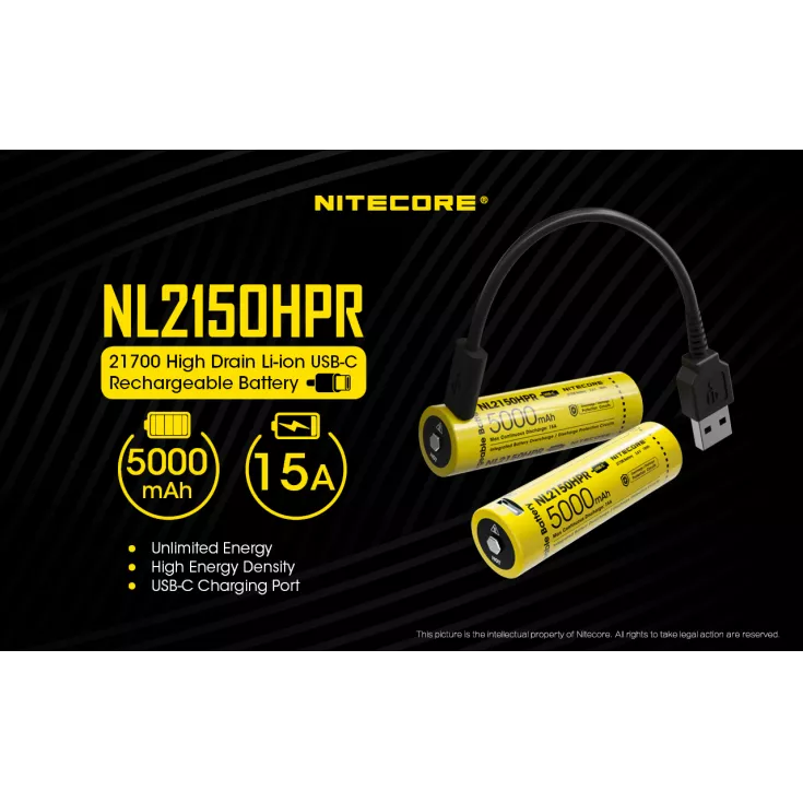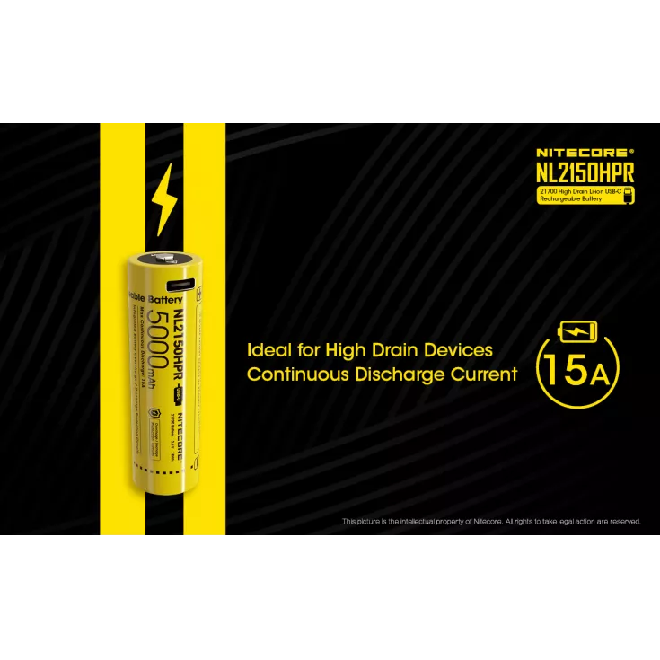 The Nitecore NL2150HPR 21700 battery is a high performance cell with a maximum capacity of 5000mAh, a 15A continuous discharge current and a USB-C charging port to remove the need for an external charger. Please note, a charging cable is not included.Â