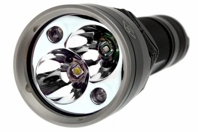 NiteCore has a truly unique range of torches called the Chameleon series. This series features several LEDs in various colours. They can all produce red, green and blue light and are located on the side of the torch. These LEDs can also operate in a strobe mode with an alternating red and blue flashing light. There are also two primary LEDs in the heart of the reflector. Naturally, the primary white source is derived from a Cree XP-G2 (R5) with a maximum output of 440 lumens. In addition to this primary white LED, there is room for a second LED. Its colour depends on the chosen variant: red, green, blue, ultra violet or infrared. Ultra violet is ideal for many applications, such as hunting, checking bank notes to see if they are counterfeit, forensics and many other uses. The primary LEDs have a considerably higher light output than the secondary LEDs located on the side of the torch. That is why it is advisable to actually select the green variant when you want green light, even though the red variant can also produce green light.