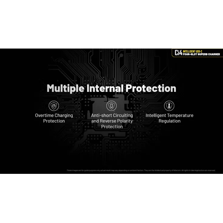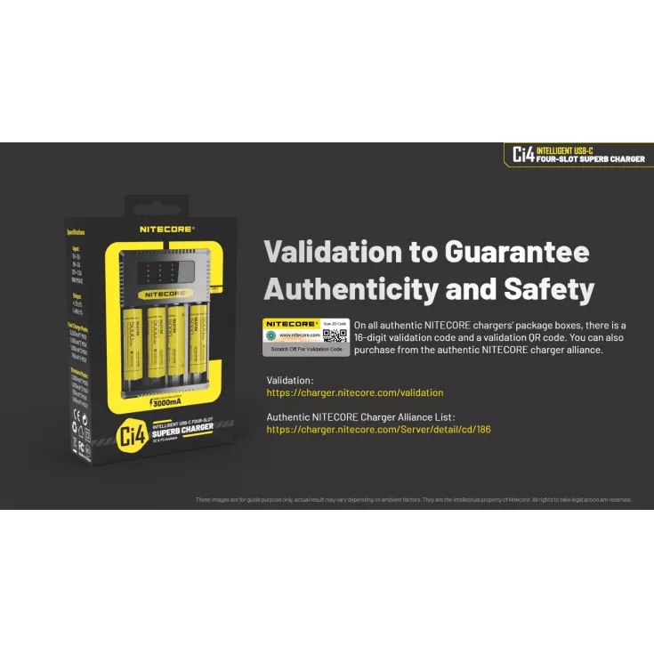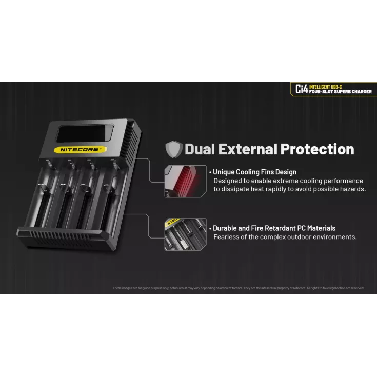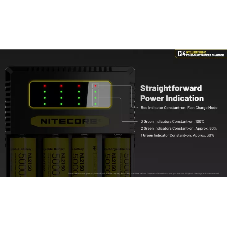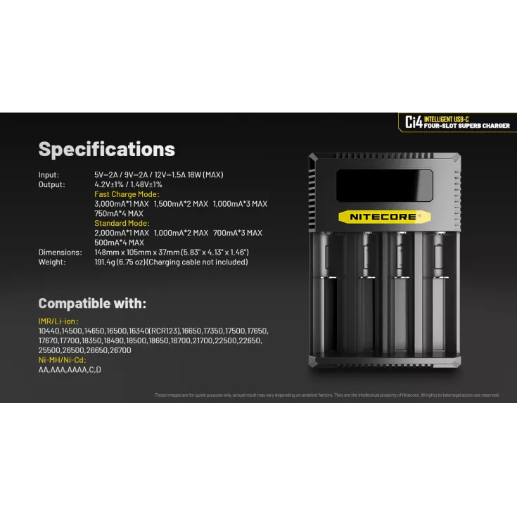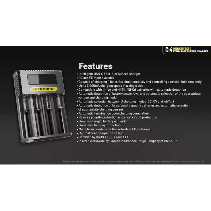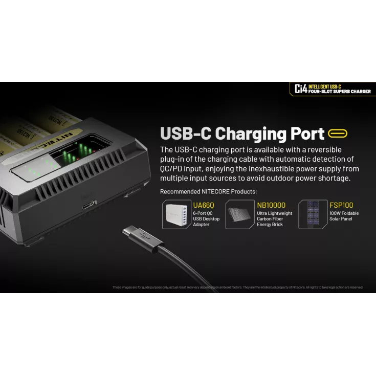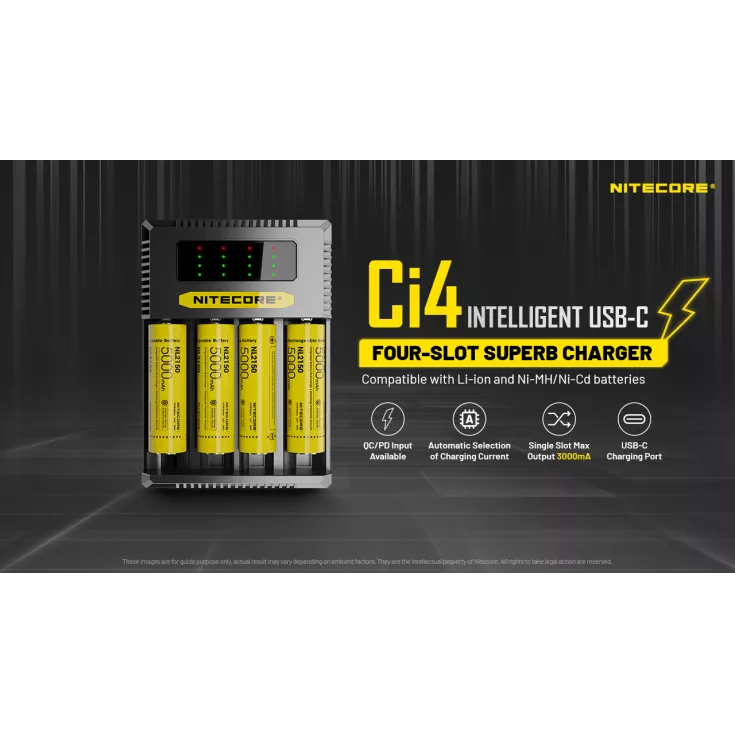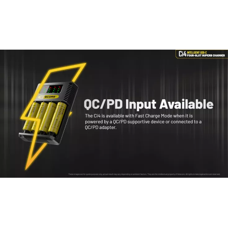 The Nitecore Ci4 is an intelligent USB-C 4 bay charger with a fast charge mode when powered by a QC/PD supportive device or connected to a QC/PD adapter. It is compatible with a wide variety of IMR, li-ion, Ni-MH and Ni-Cd batteries.