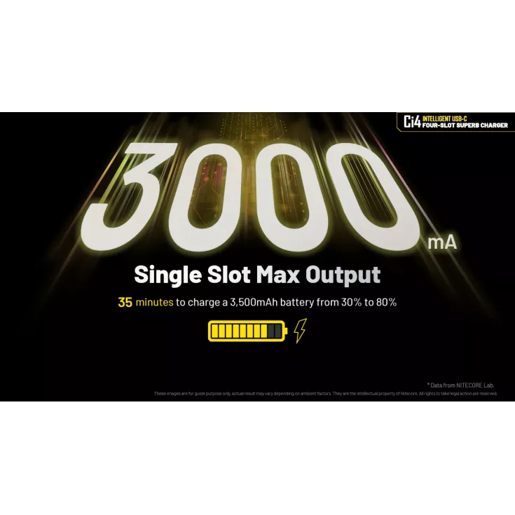 A single slot has a maximum output of 3000mA and can take a 3500mAh battery from 30% to 80% in just 35 minutes!Â