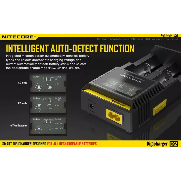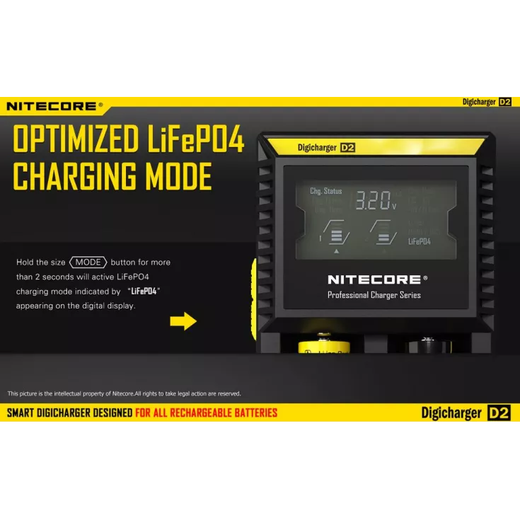 The D2 EU automatically detects Li-ion, Ni-MH and Ni-Cd batteries, and through manual selection is also capable of charging LiFePO4 batteries.