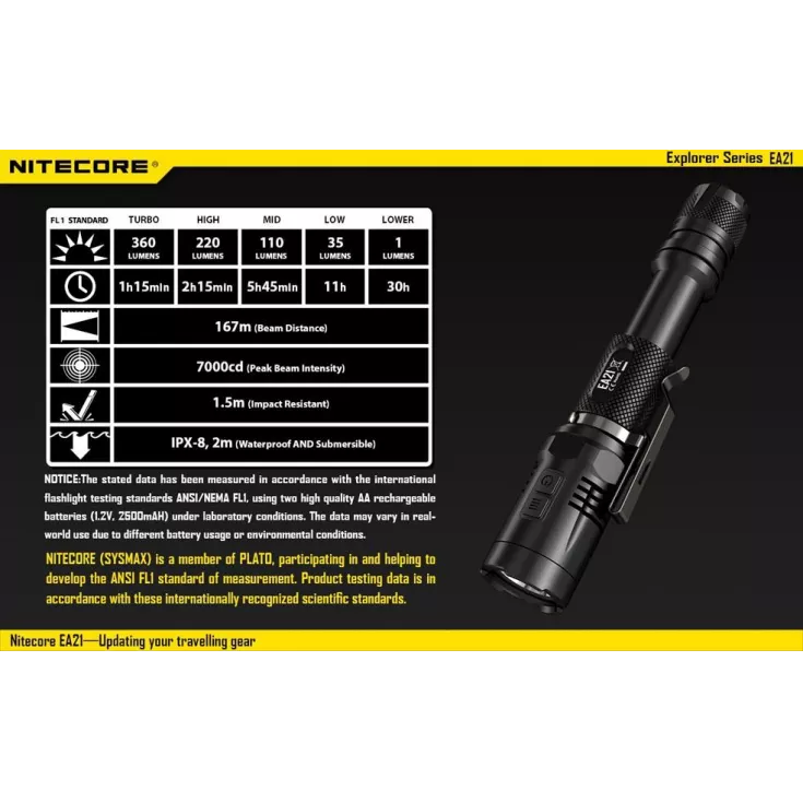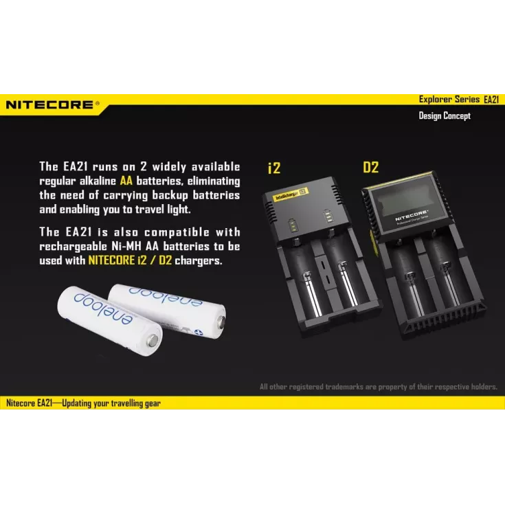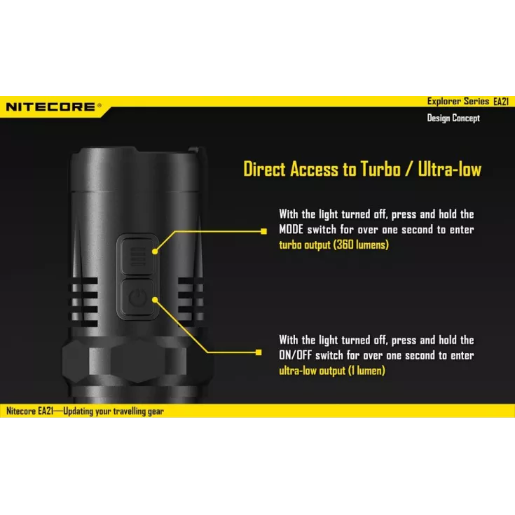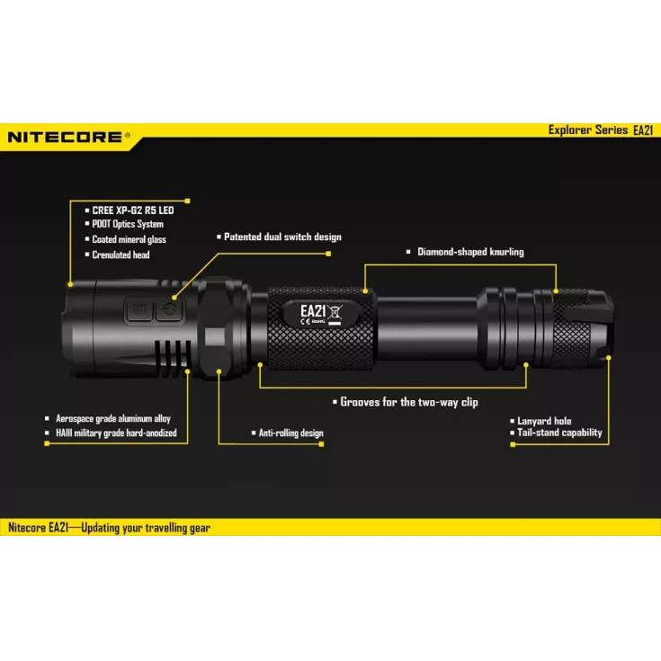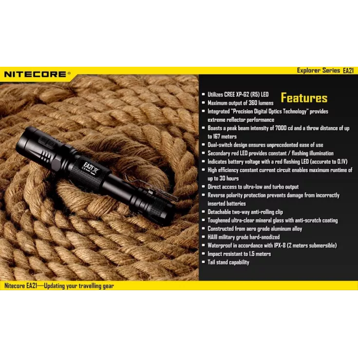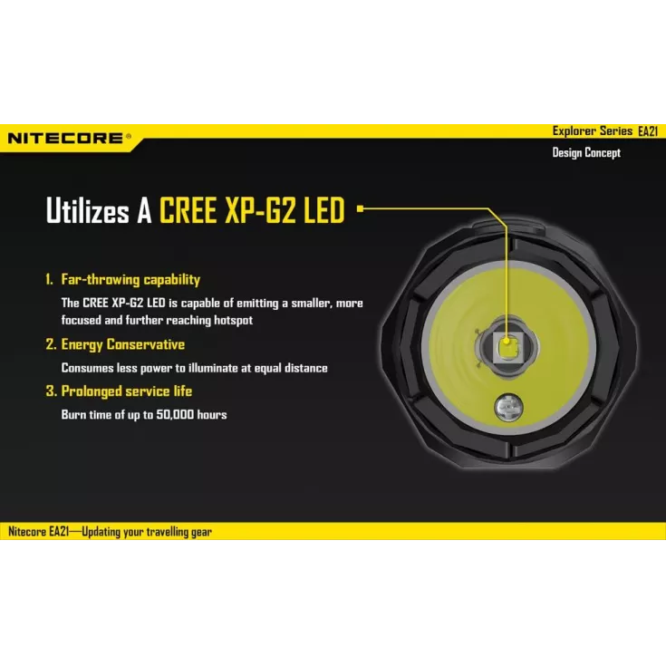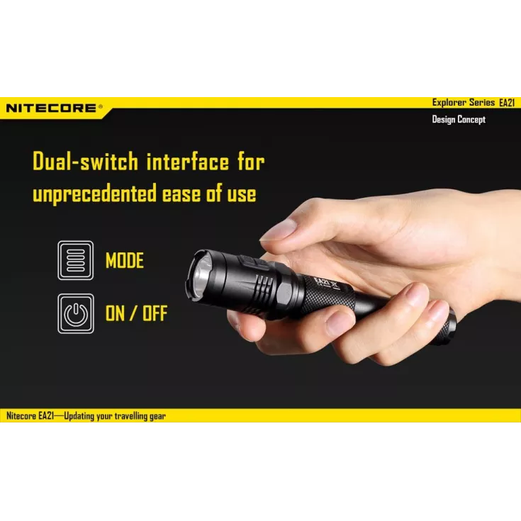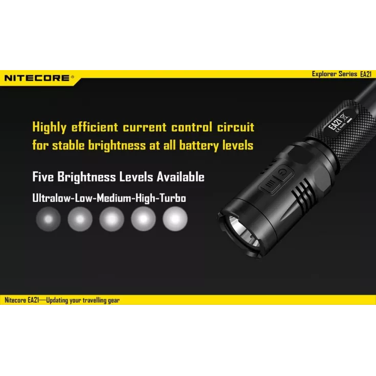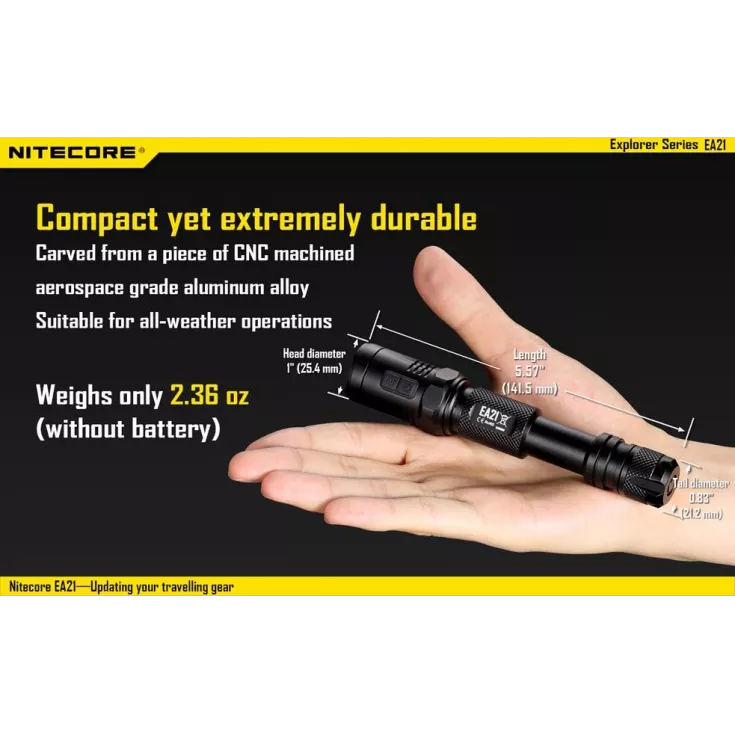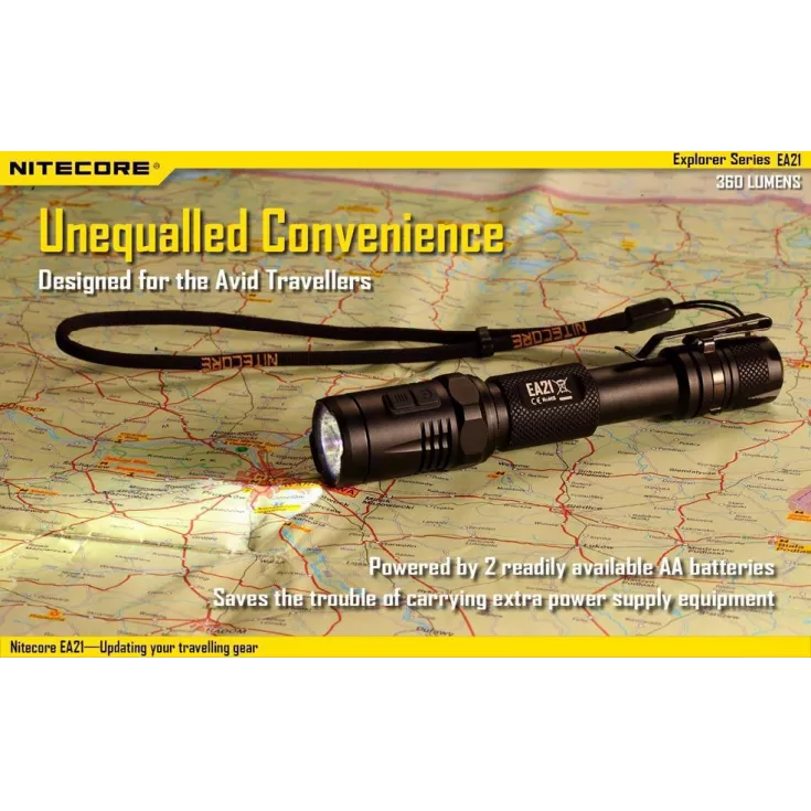 The Nitecore EA21 has a maximum brightness of 360 lumens from the XP-G2 (R5) LED.