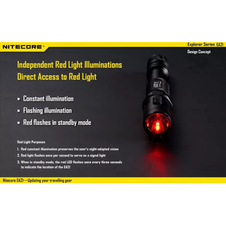 In addition to the main white output the EA21 features a secondary red LED for when only a small amount of light is required without degrading the users night adapted vision. When in standby mode the red LED flashes once every three seconds to help locate the flashlight. When the tail cap is tightened after battery installation the red LED will flash to indicate the battery voltage (accurate to 0.1V – patented) making the EA21 a portable multi-meter,