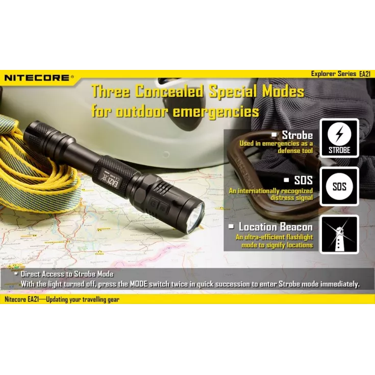 Three concealed special modes are also available: Strobe, SOS and Location Beacon. Direct access to strobe is possible by pressing the mode switch twice in quick succession.