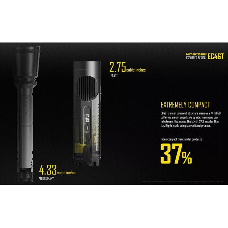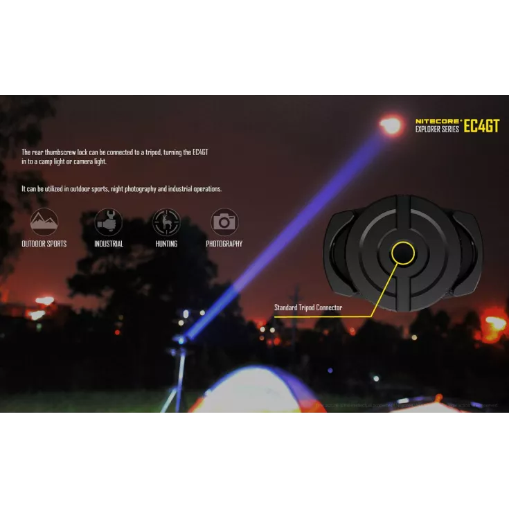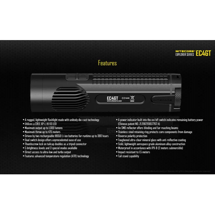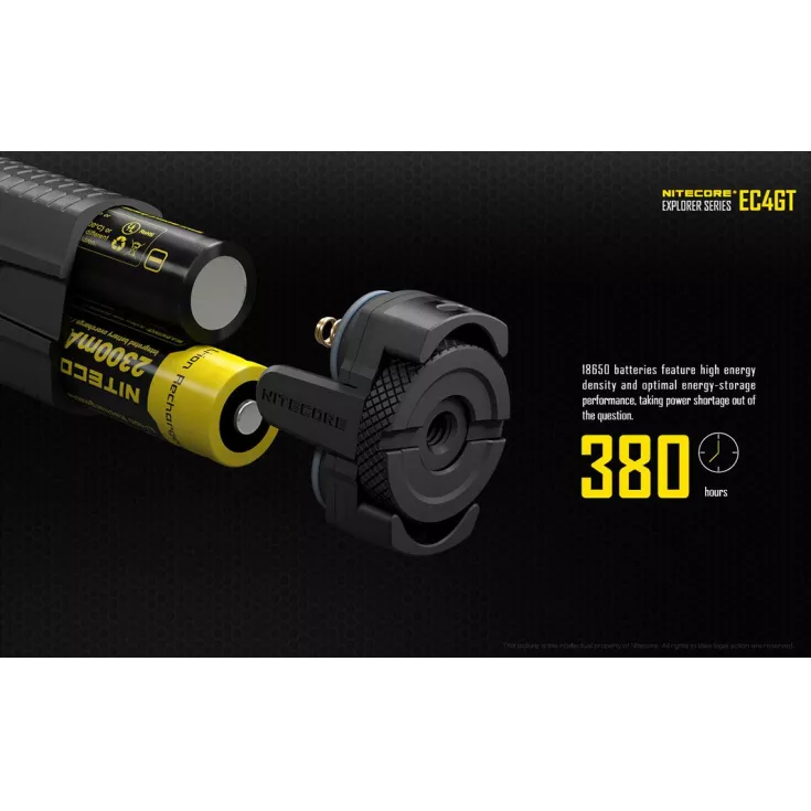 The Nitecore EC4GT has a maximum output of 1000 lumens from the Cree XP-L HI V3 and can be powered using either 4 x single use CR123 or 2 x rechargeable Li-ion 18650 batteries.