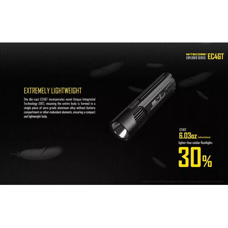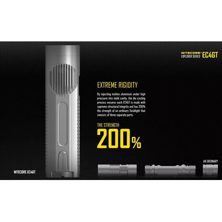 The die-cast torch is extremely lightweight as the entire body is formed in a single piece of aero grade aluminium without a battery compartment or other redundant elements; excluding batteries the torch weighs a mere 170 g. In addition to the weight, the material of the torch is excellent for heat dissipation, allowing the torch to have long runtime without the fear of overheating.