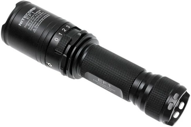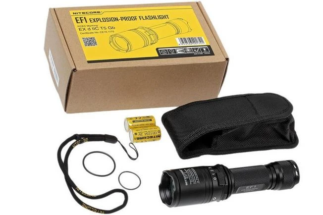 The Nitecore EF1 flashlight is a very versatile torch. This torch is designed to function in potentially hazardous environments and can be used for industrial purposes. The Nitecore EF1 is EX d IIC T5 Gb certified. The walls of the reinforced housing are 3 mm thick. The epoxy resin optical lens is 10 mm thick and has an explosion suppressing function. It is explosion proof (d 11C) and well protected for environments where gas formation could occur (T5 Gb). The combination of these properties prevents an explosion if the flashlight comes into a gas-rich environment. This is also the reason why the Nitecore EF1 is explosion-proof.