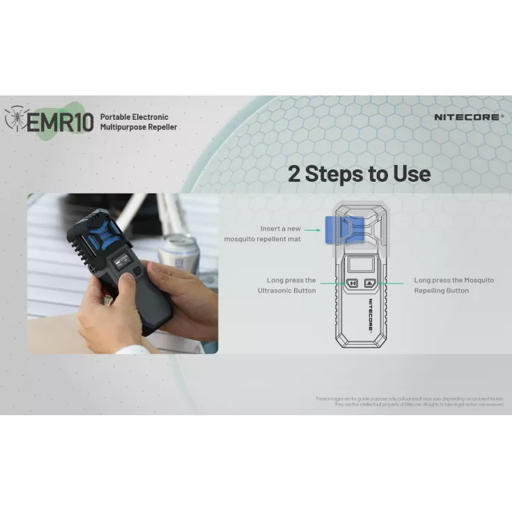 Designed with a safe and efficient heating system, the EMR10 combines heat activation and a repelling mat to repel mosquitoes in as little as 10 minutes. Additionally, an ultrasonic sound function can ward off pests such as insects, mice, snakes, cockroaches and skunks.