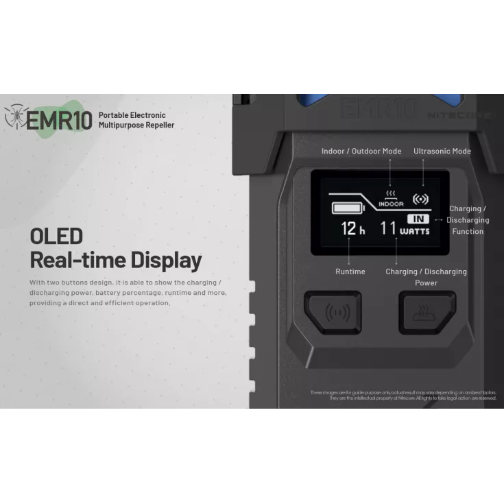 The EMR10 has an OLED display screen which provides information on the runtime, charging and discharging power, charging and discharging function and whether in ultrasonic or indoor/outdoor mode. In outdoor mode the device has a 16 foot protection zone and 11 foot for indoor mode.