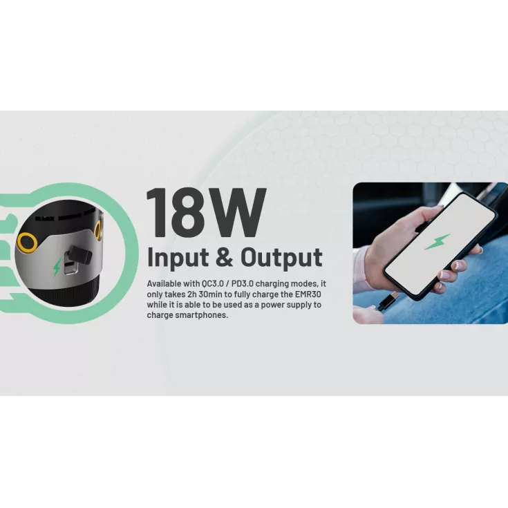 The built-in li-ion battery is rechargeable via USB-C (charging cable included) and can be used as a power supply to charge your electronic devices.