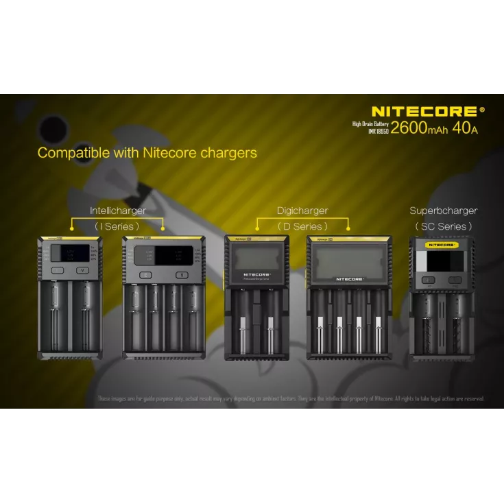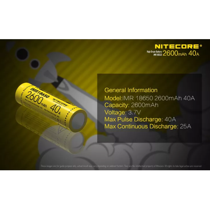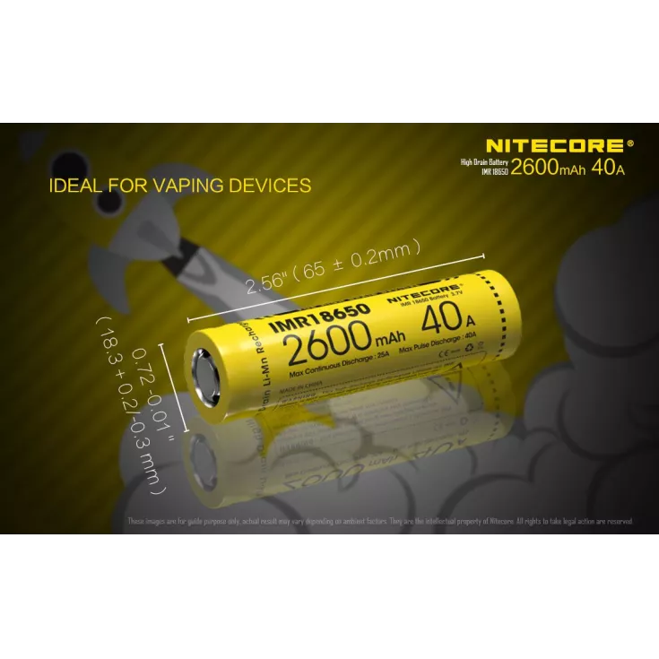 The Nitecore IMR 18650 high drain, Li-mn battery features a capactiy of 2600mAh and discharge current up to 40A. Ideal for vapers, the battery is compatible with Nitecore chargers, including the Intellicharger and Digicharger series.