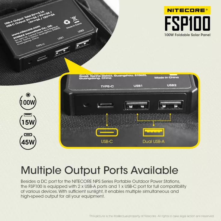 The FSP100 features a DC port for the Nitecore power station along with 2 x USB-A ports and 1 x USB-C port for full compatibility to various devices.