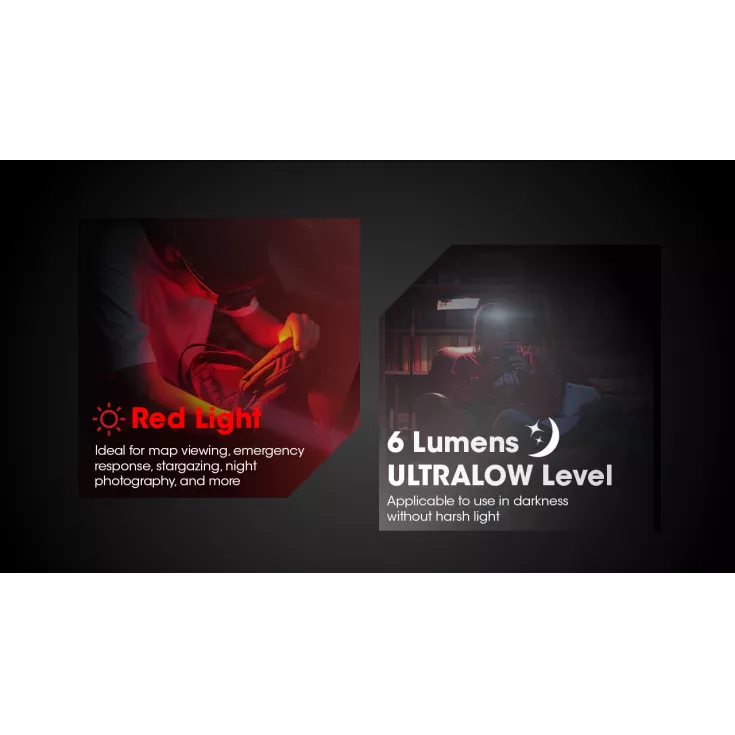 Ultralow: 6 lumens – 160 hrs runtime – 15 meters