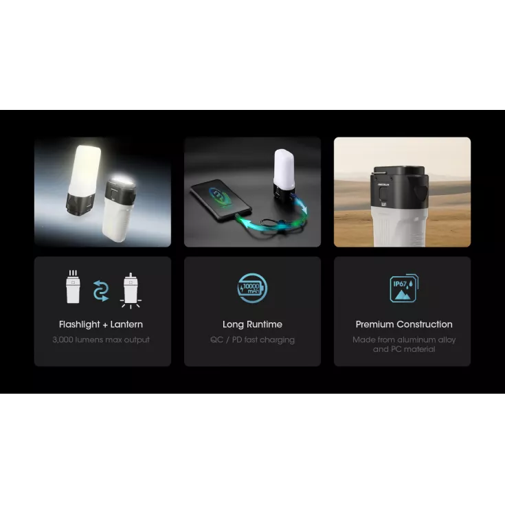 The Nitecore LR70 3-in-1 rechargeable lantern flashlight has a maximum output of 3000 lumens created by the 2 x luminus SST40 LEDs. It’s design allows the flashlight to be used as a lantern and flashlight as well as a power bank when you need a little extra charge. The lantern is powered by a built-in 10,000mAh battery.