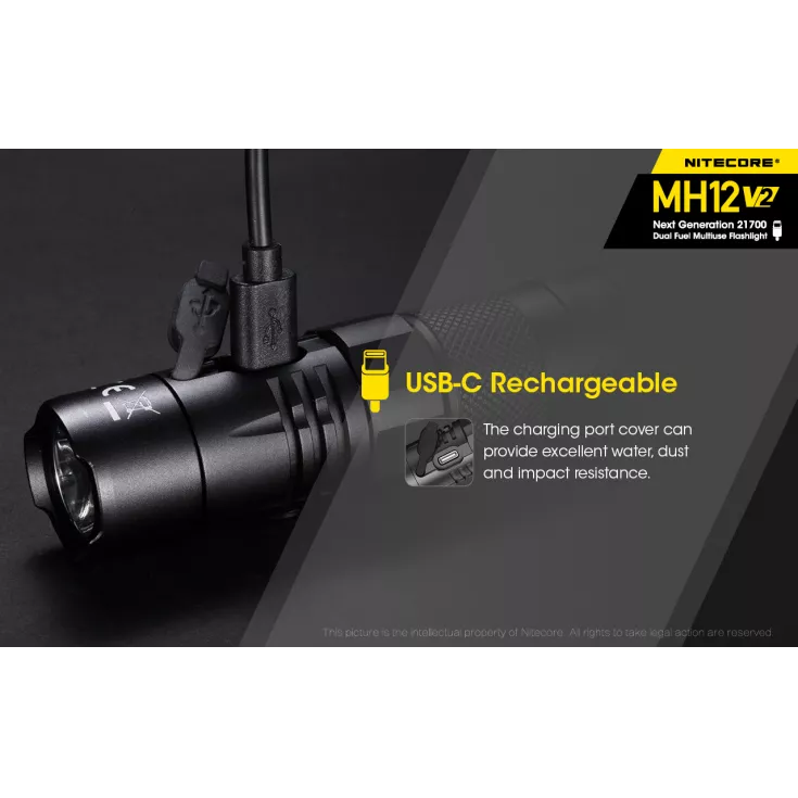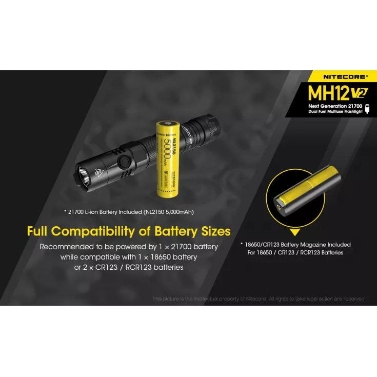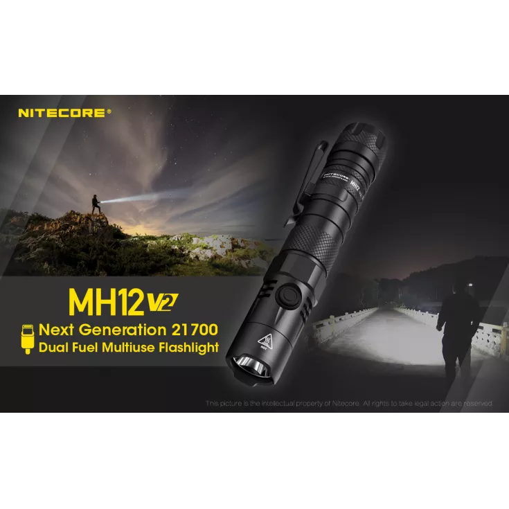 The next model in an evolution of a classic and much-loved torch, the Nitecore MH12 V2 has an improved output, runtime and design than its predecessors. The V2 flashlight has a maximum output of 1200 lumens from the Cree XP-L2 V6 LED and can be powered using 1 x 21700 (included) or 1 x 18650 or 2 x CR123/RCR123 with the included battery magazine.