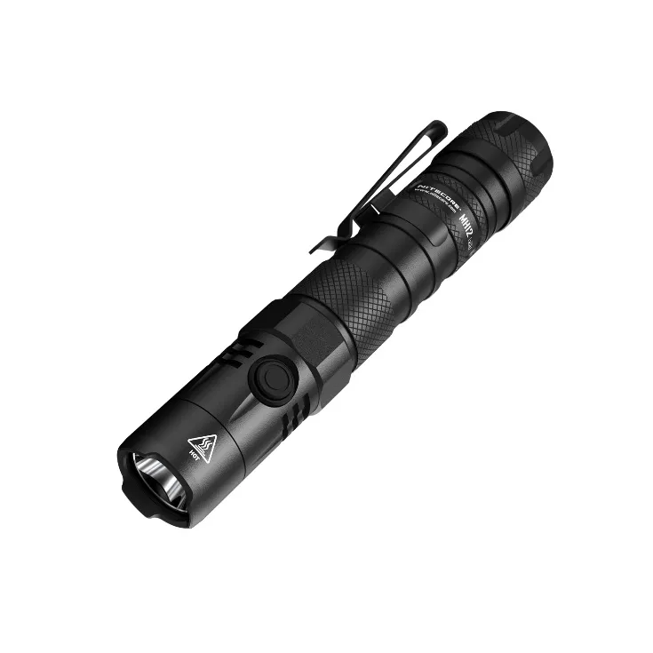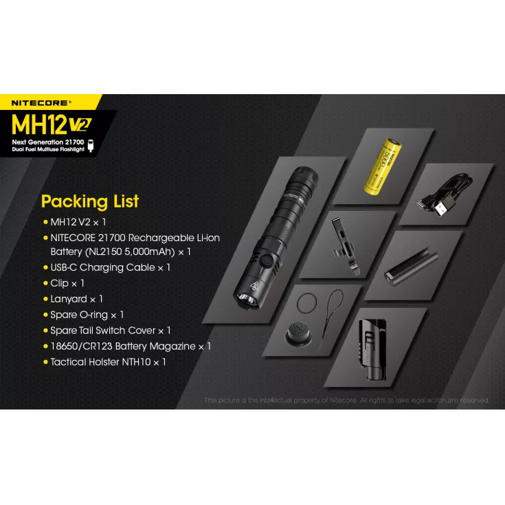 The Nitecore MH12 V2 comes with an NTH10 tactical holster for quick release and access to the torch, plus a sturdy pocket clip. The flashlight is compatible with a range of other accessories, such as the NTR10 tactical ring, 25.4 mm (1″) filters and diffuser tip (available separately).