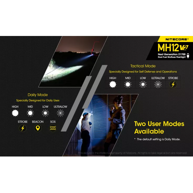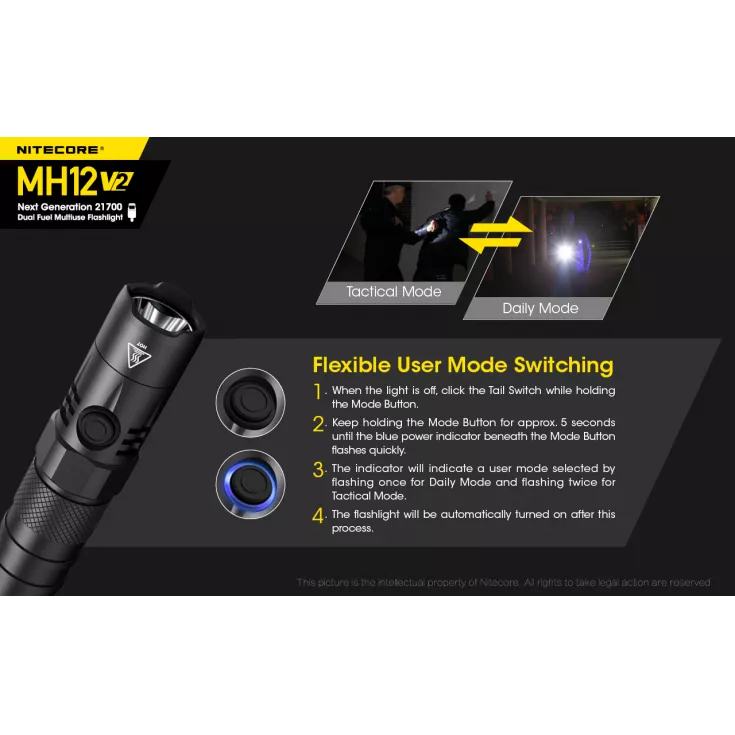 The flashlight has four brightness levels, ranging from 1 to 1200 lumens, plus three special modes including a randomly changing strobe which provides a dizzying effect for emergency situations. Additionally, the MH12 V2 torch has a default daily mode which provides access to all the above mentioned outputs, and a tactical mode which can access the four brightness levels and strobe mode only, making it suitable for tactical applications.