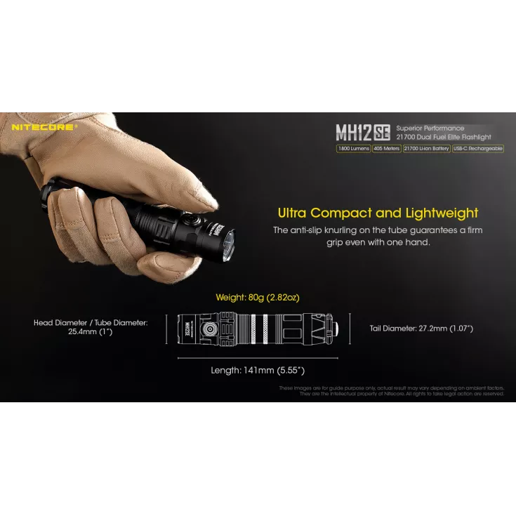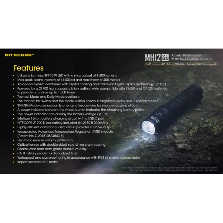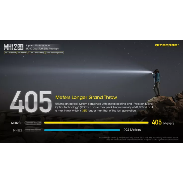 The Nitecore MH12SE superior performance 21700 dual fuel elite flashlight is equipped with a Luminus SFT-40-W LED providing a maximum output of 1800 lumens and an impressive throw of 405 meters.