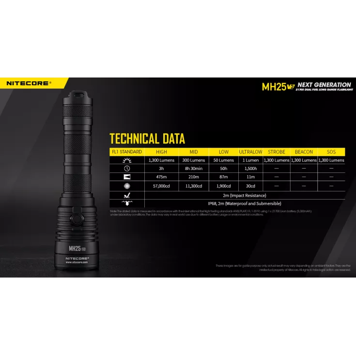 High: 1300 lumens – 3 hours – 475 meters