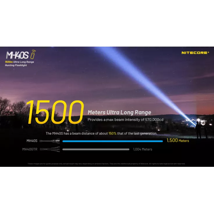 The Nitecore MH40S is a powerful tactical torch with an impressive maximum output of 1500 lumens and a long range of 1500 meters. The flashlight is rechargeable using the USB-C charging port and can be fully charged in less than 3 hours, using the included QC 3.0 adapter.  Â