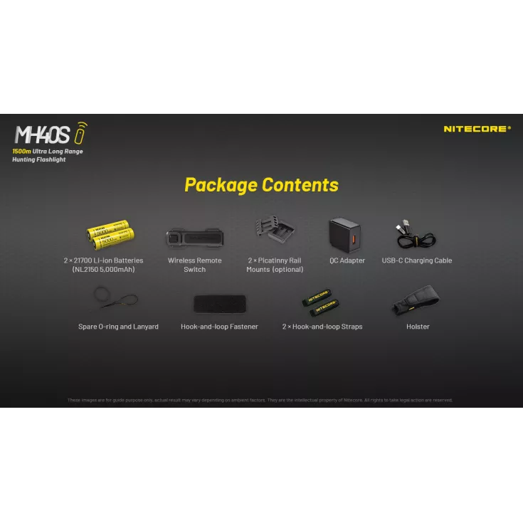 Includes: 2 x Nitecore 21700 Li-ion batteries, wireless remote switch, QC adapter, USB-C charging cable, spare o-ring, hook-and-loop fastener, 2 x hook-and-loop straps, holster.