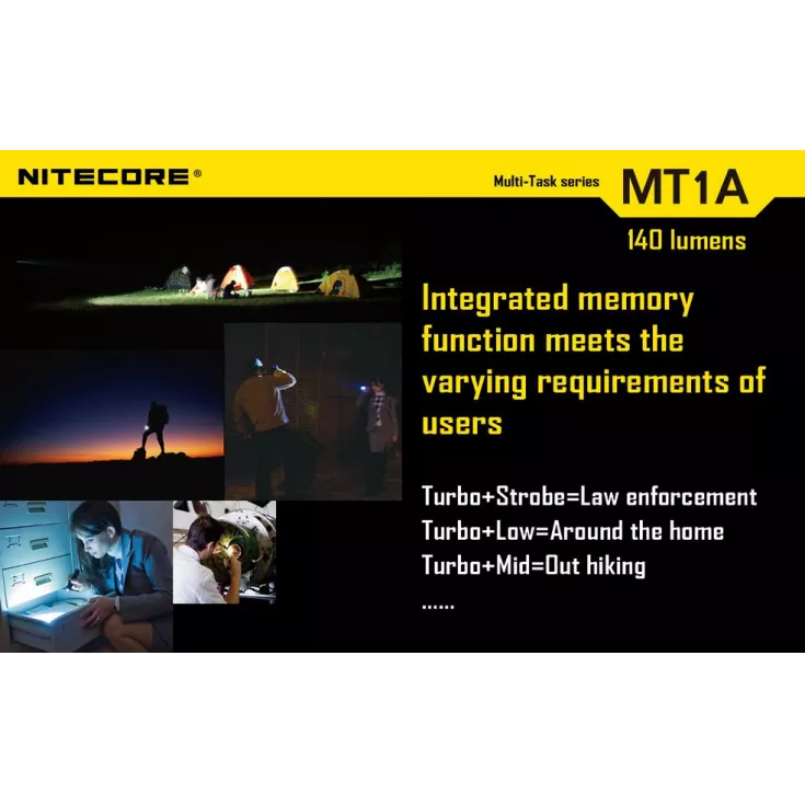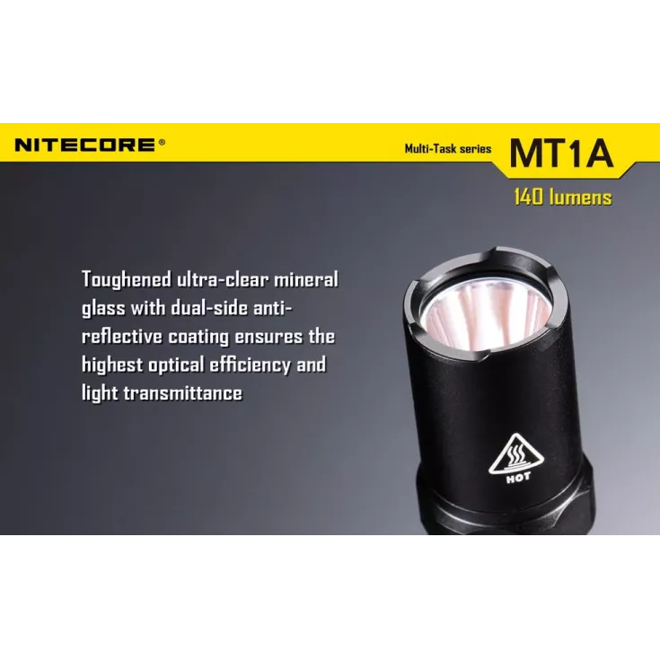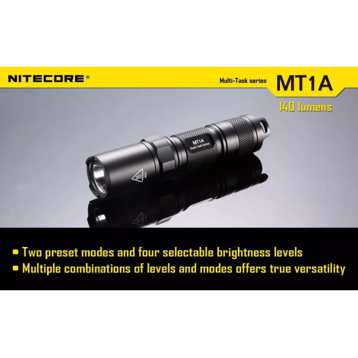 The MT1A has four brightness levels plus strobe and SOS flashing modes. With the head in the tightened position the light will activate in turbo mode, lowering the output after three minutes to prevent over-heating. With the head slightly loosened the light will cycle through the other three brightness levels and two flashing modes. These levels have memory function.