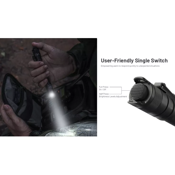Operation is via a single tail switch. Full press for on and off – Half press to change brightness levels.