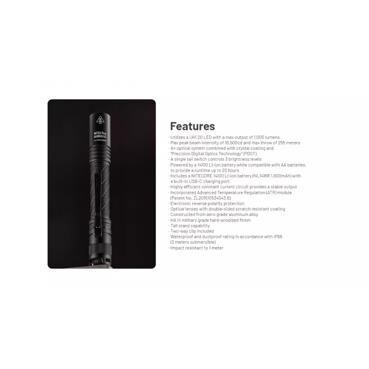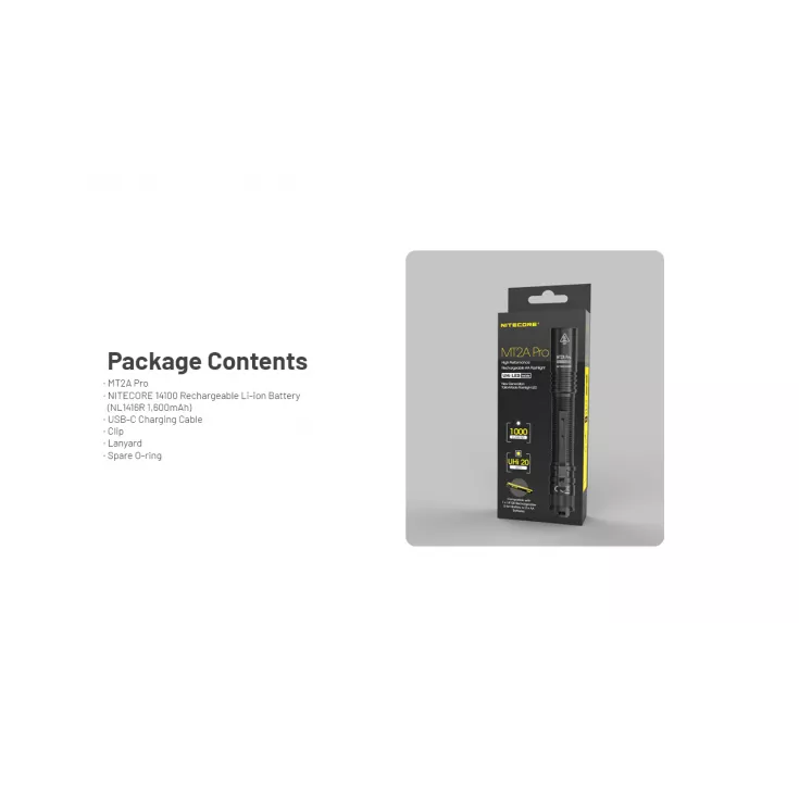 The Nitecore MT2A Pro is a high performance rechargeable flashlight that can be powered by the included 1600mAh Li-ion battery or two AA batteries. To charge simply remove the battery and plug the provided USB-C cable directly into the port on the side of the battery.