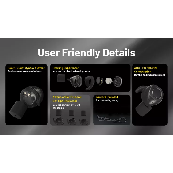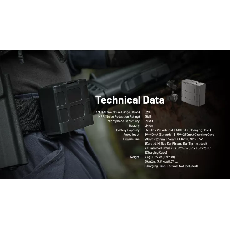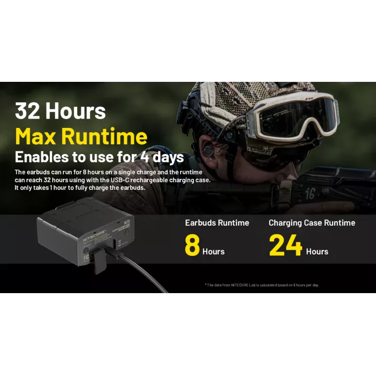 The NE20 comes with a tailor-made charging case specially designed for tactical applications with multiple carry options making them a perfect everyday carry for tactical use such as shooting training . The buds can run for 8 hours on a single charge and a runtime reaching 32 hours when using the USB-C recharging case. The earbuds take just one hour to fully charge.Â