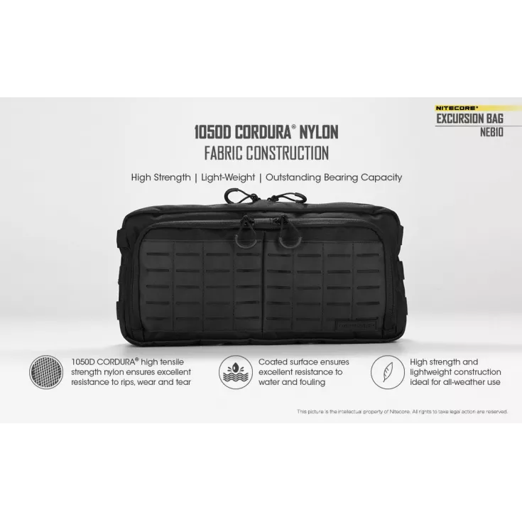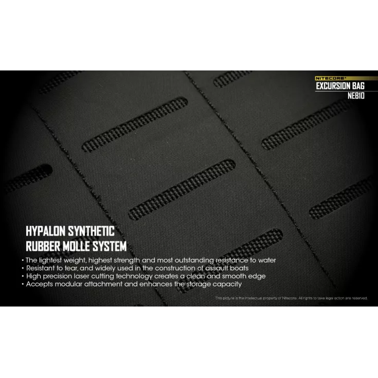 Made from 1050D Cordura high tensile nylon, which provides excellent resistance to rips and general wear and tear with a coated surface to help repel water. The front of the NEB10 features Hypalon synthetic rubber molle system. This material is extremely strong, yet lightweight and is widely used in the construction of assault boats. High precision laser cutting technology creates a smooth clean edge and accepts modular attachments to further increase capacity.