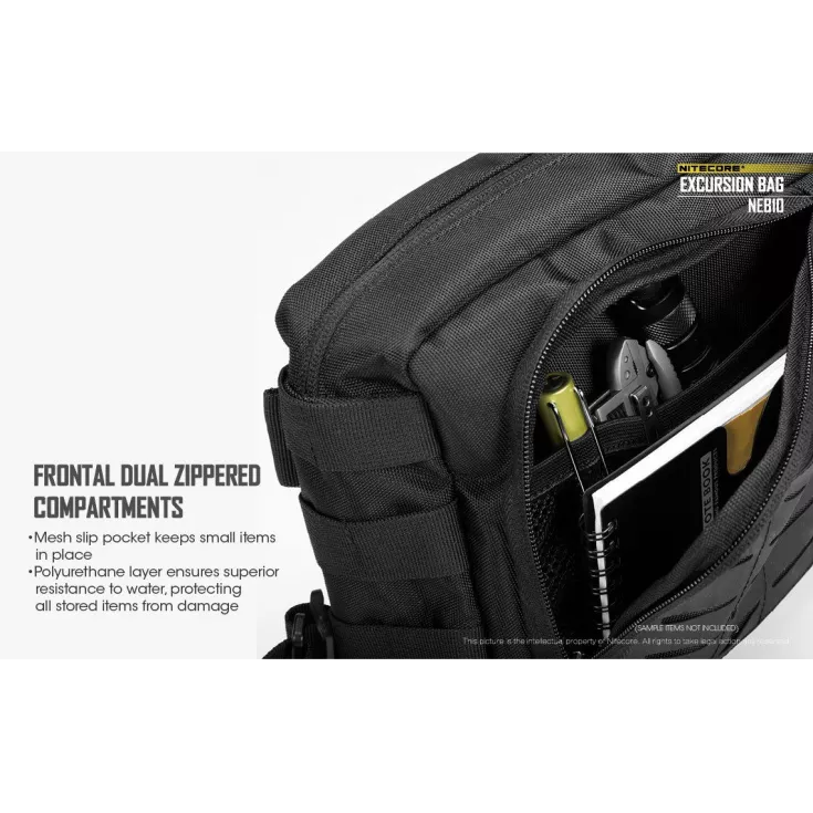The main compartment features a built in surface to accept hook and loop organisers (available separately) and six channel elastic organisation for storing multiple tools. Frontal dual zippered compartments are ideal for keeping smaller items in place and a polyurethane layer ensures superior water resistance to help protect stored items. At the rear of the NEB10 there is a mesh storage pocket. Â