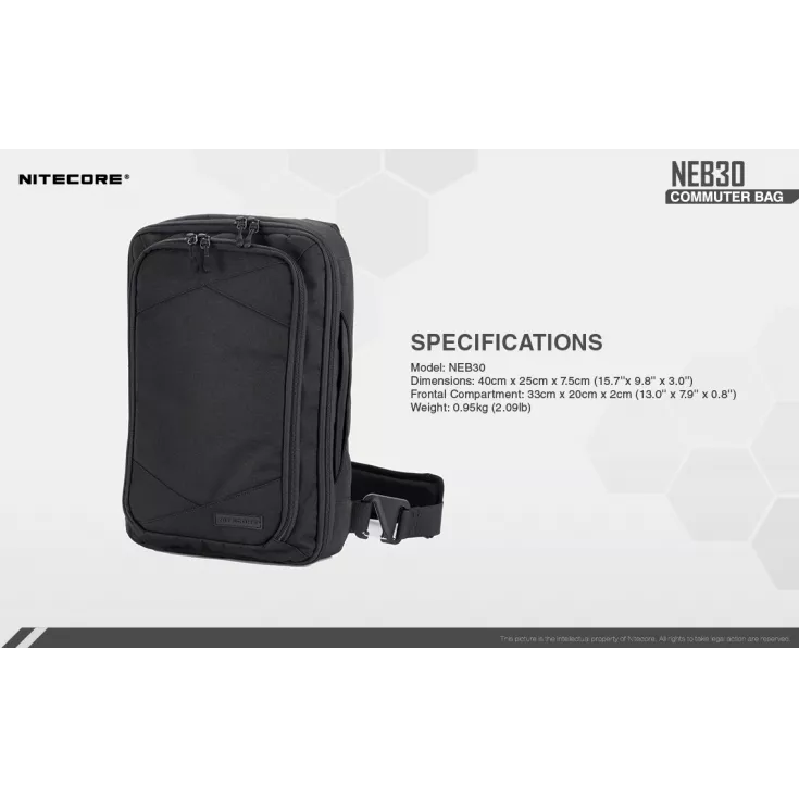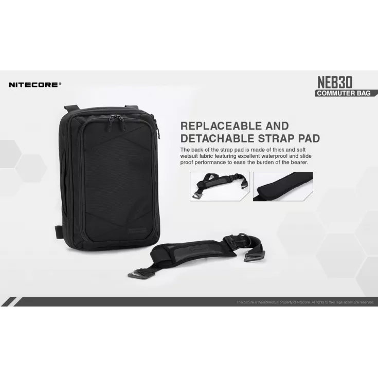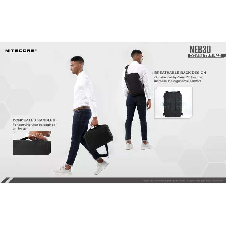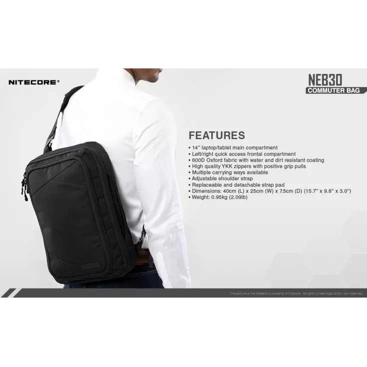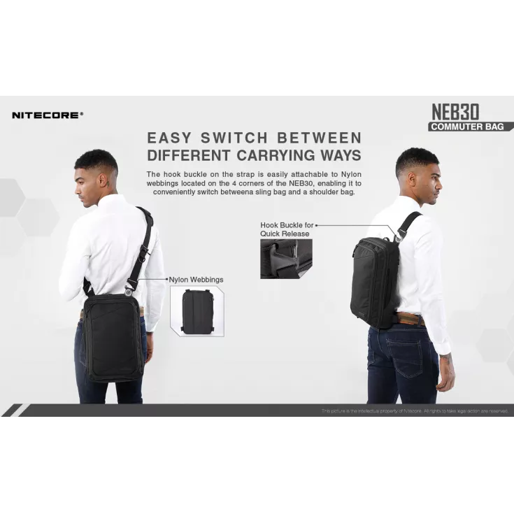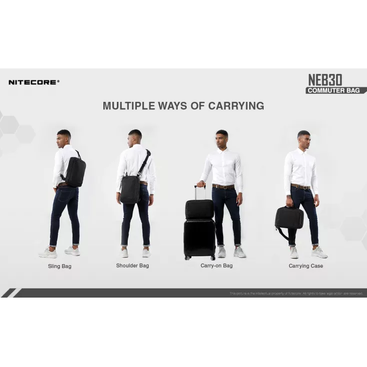 The Nitecore NEB30 messenger style bag offers multiple options for how to carry it, offering versatility and flexibility to adapt to various applications. The pack can be worn as a sling bag, a shoulder bag, a carry-on or carrying case.Â