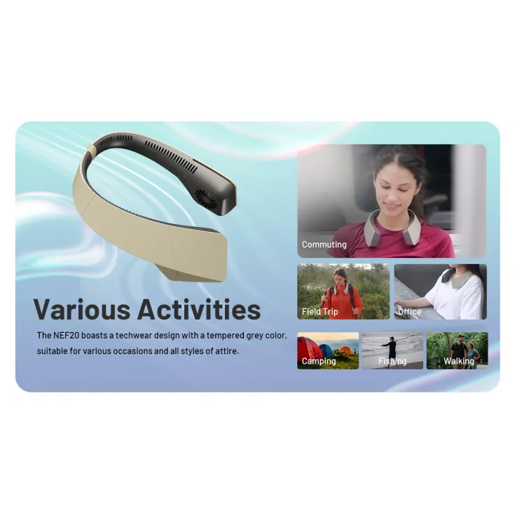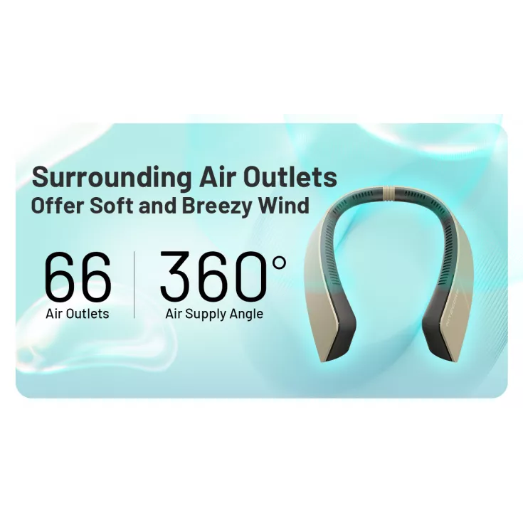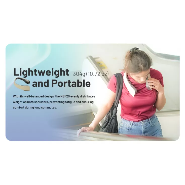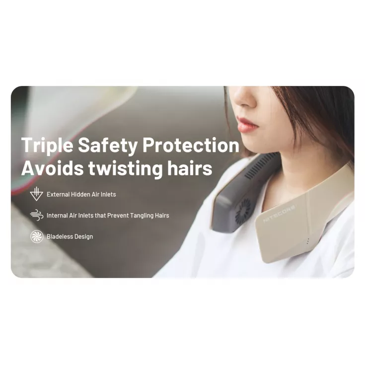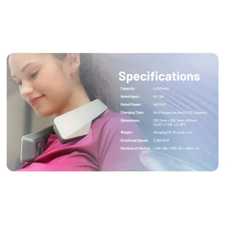 The neck fan offers 3 wind speeds and a single switch interface. A central flexible silicone inlay allows the fan to be adjusted to fit all necks. The evenly distributed weight on both shoulders prevents fatigue and ensures comfort during long commutes. With external hidden air inlets, internal air inlets and bladeless design, the neck fan has triple safety protection and avoids tangling hair.
