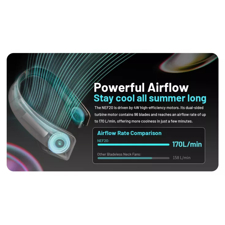 The powerful airflow is driven by a 4W high-efficiency motor and reaches an airflow rate of up to 170L/min, offering more coolness in just a few minutes.