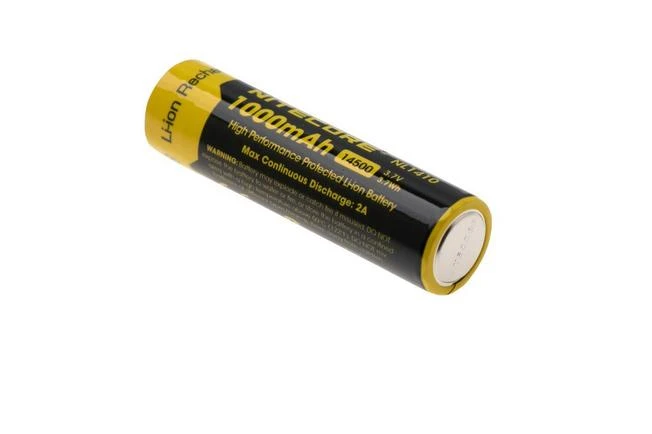 The NiteCore NL1410 14500 is a Li-ion battery for flashlights and other devices that ask a lot from their batteries. In terms of size this battery is similar to an AA battery or penlite. The main difference is that this NiteCore 14500 NL1485 uses Li-ion technology, instead of alkaline or Ni-MH. As a result, this 14500 can supply you with a higher 2A output.