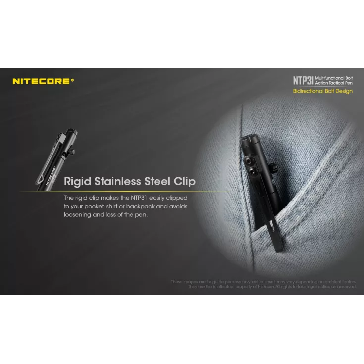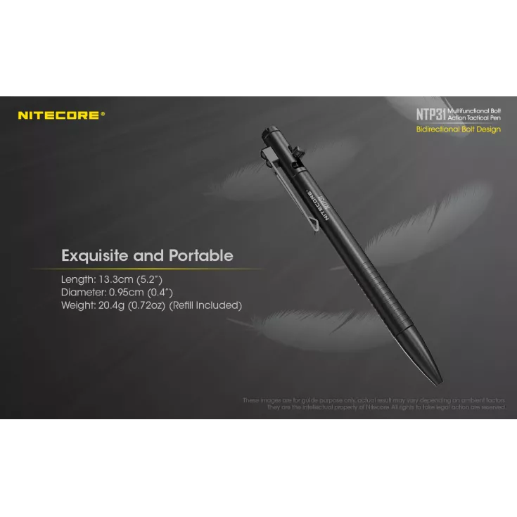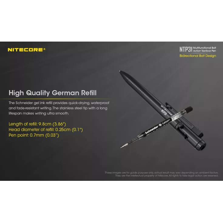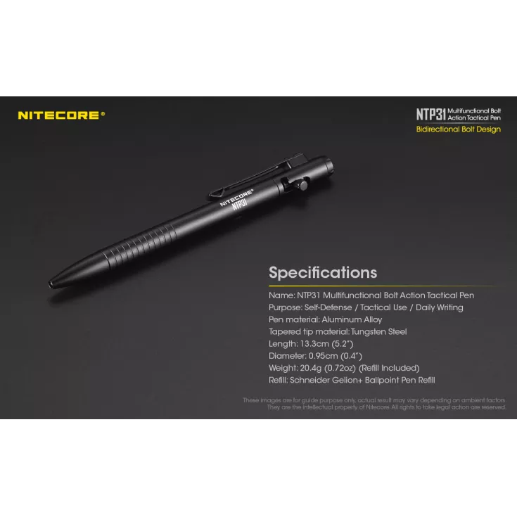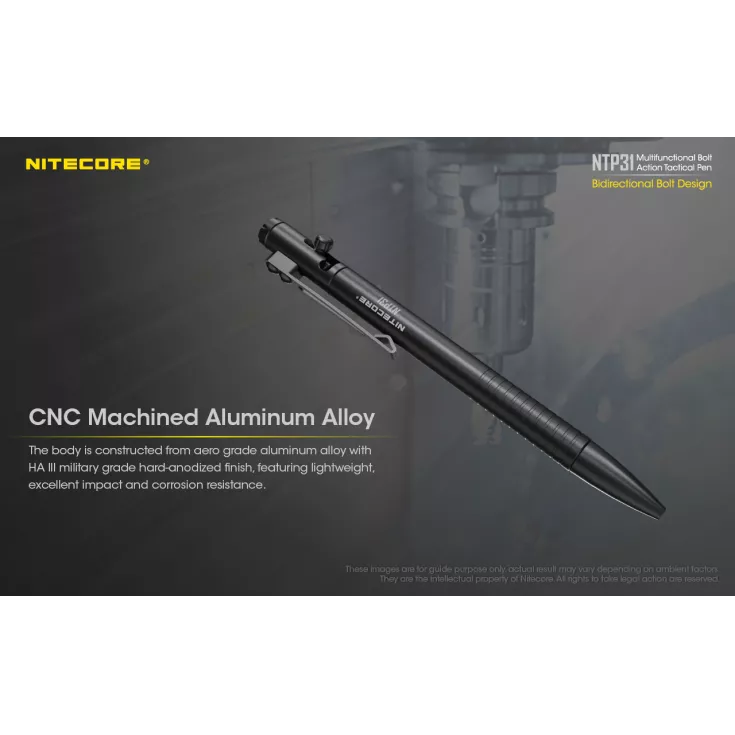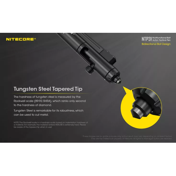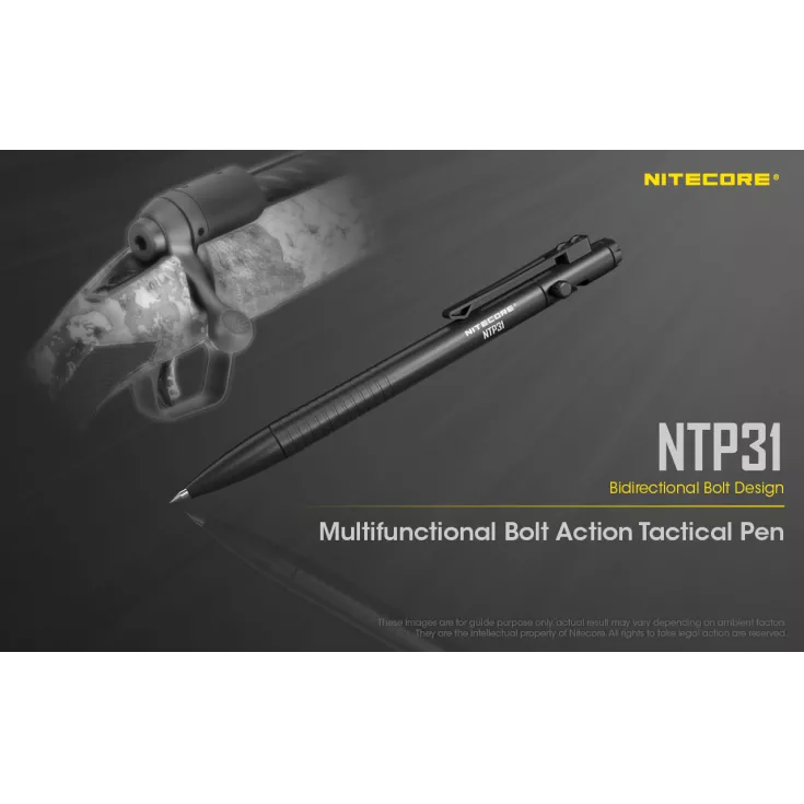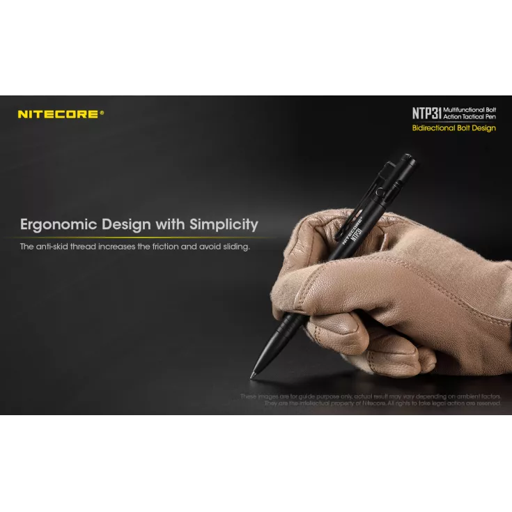 The Nitecore NTP31 is a multifunctional pen featuring a bi-directional bolt action design to smoothly transition between selecting either the pen refill or the tungsten steel tapered tip.