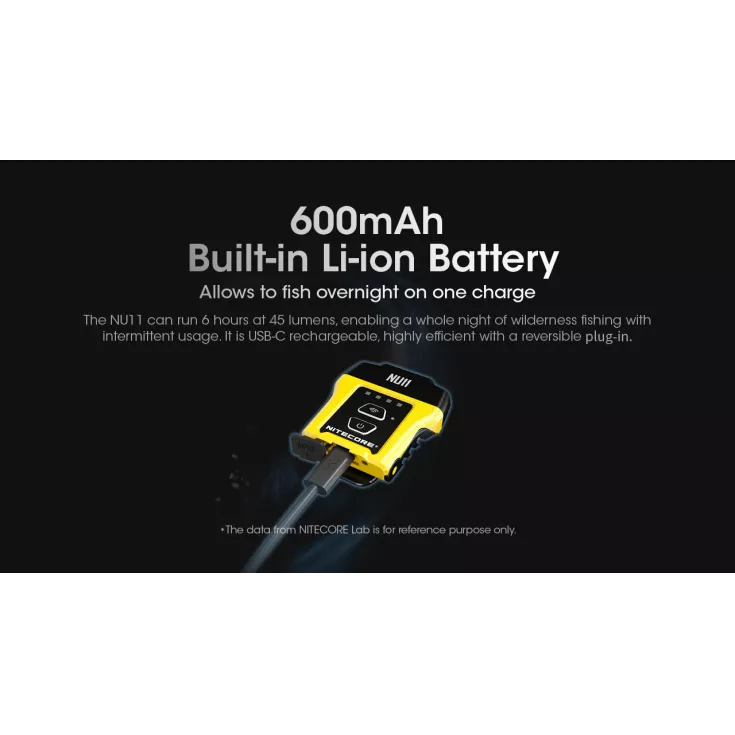 The NU11 is rechargeable and features a built-in 600mAh Li-ion battery. It can run for 6 hours at 45 lumens. USB-C charging cable is included.