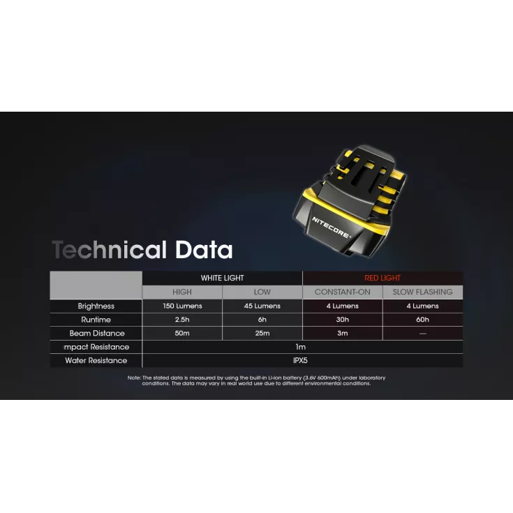 150 lumens white light maximum output with a range of up to 50 meters. Separate red light short range lighting with red safety warning light.