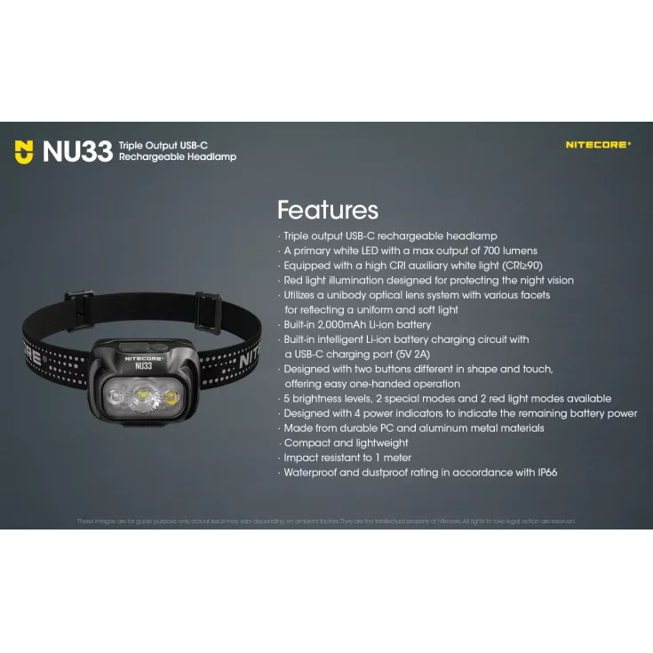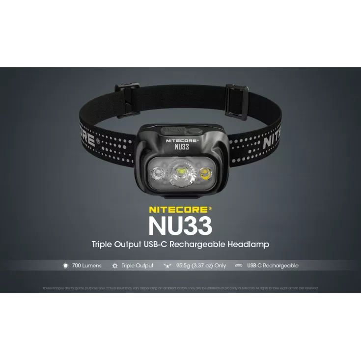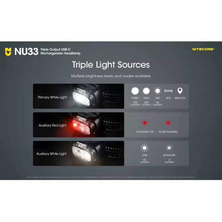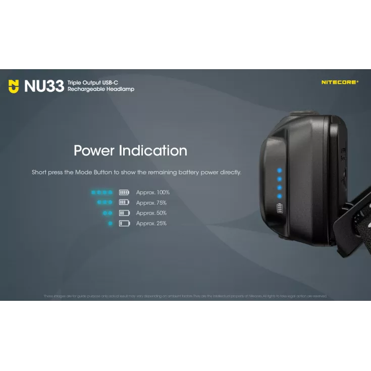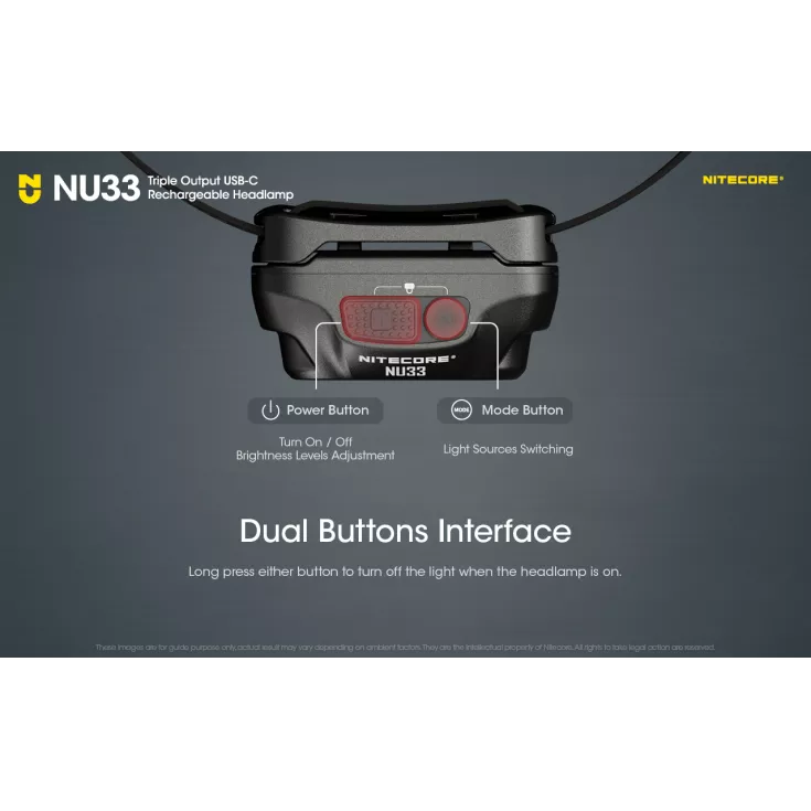 The NU33 features a primary white light, plus an auxiliary red light and an auxilary white light. The auxilary red is useful when stargazing, wildlife observations, night photography and emergency response. All outputs can be accessed with the user-friendly dual button interface. A battery power indicator can also be accessed with a short press of the mode button. Â