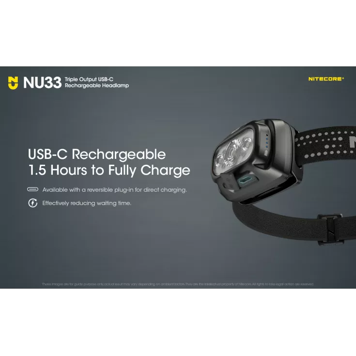 Nitecore NU33 includes:Â headlamp, headband, USB-C charging cable.