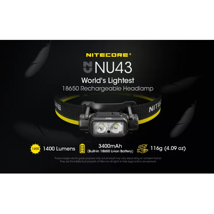 The Nitecore NU43 is the worlds lightest 18650 rechargeable headtorch, weighing just 116g (4.09oz). The torch offers a maximum output of 1400 lumens and a beam range of up to 130 meters.