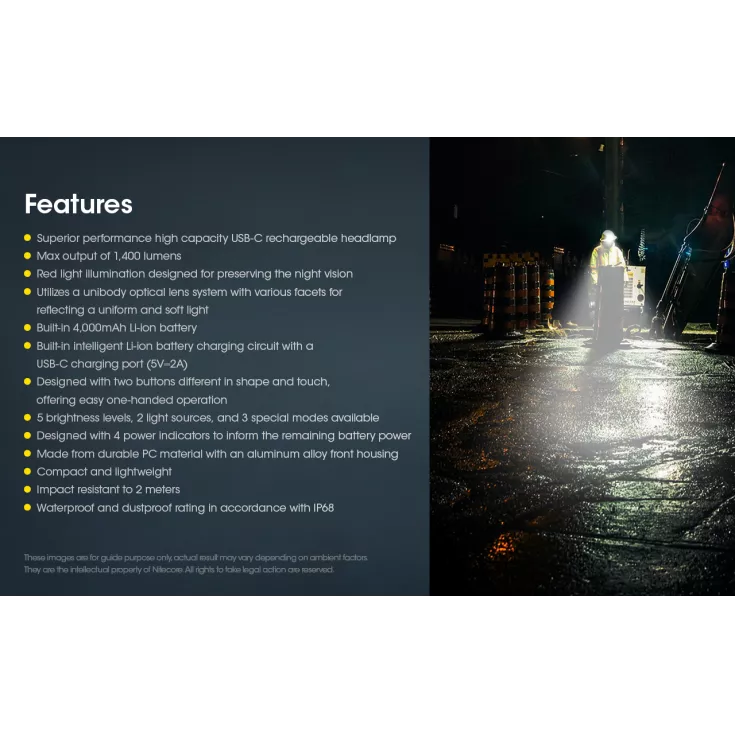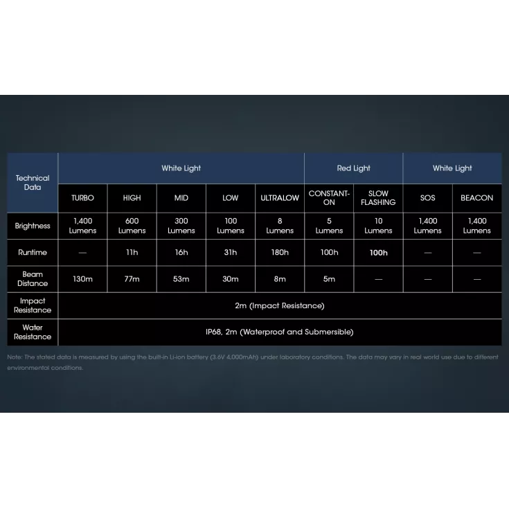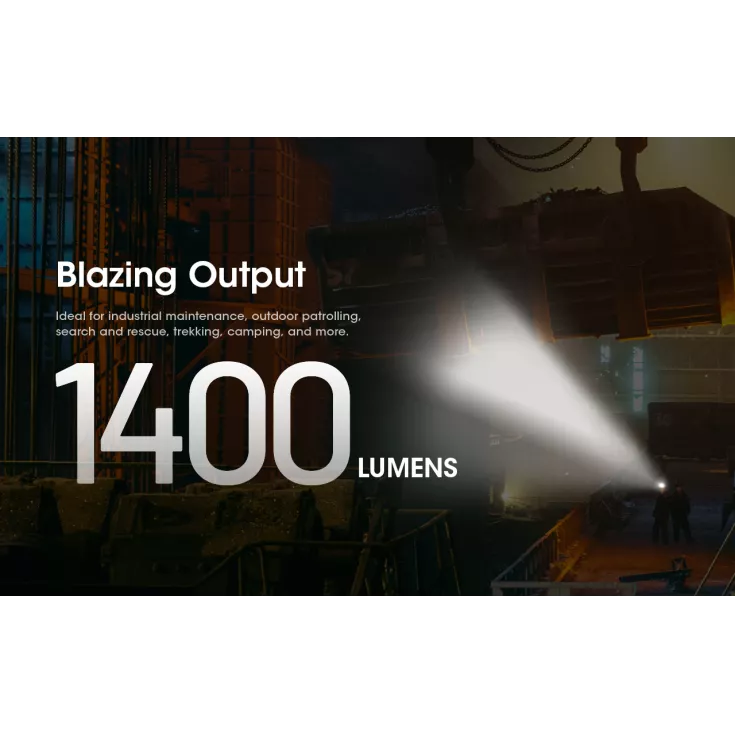 The Nitecore NU50 sits at the high end of the Nitecore NU range with a maximum output of 1400 lumens and features a built-in rechargeable 4000mAh 21700 Li-ion battery, which is charged via USB-C port with rotating protective cover. Time to fully charge the NU50 is only 2.5 hours and in addition to the main white beam, the NU50 also features an auxiliary red light.