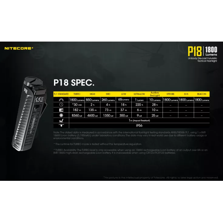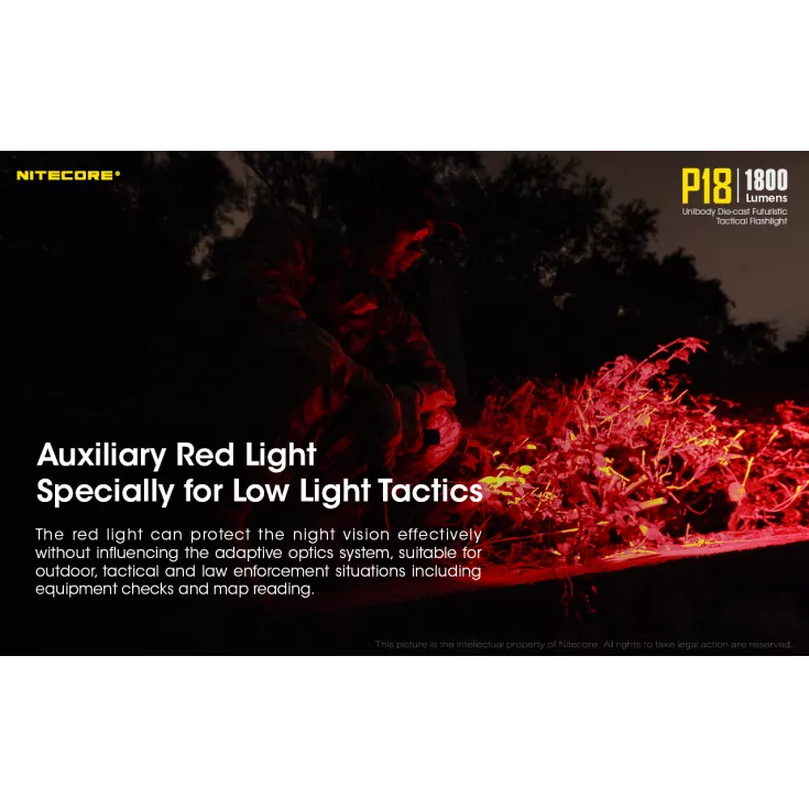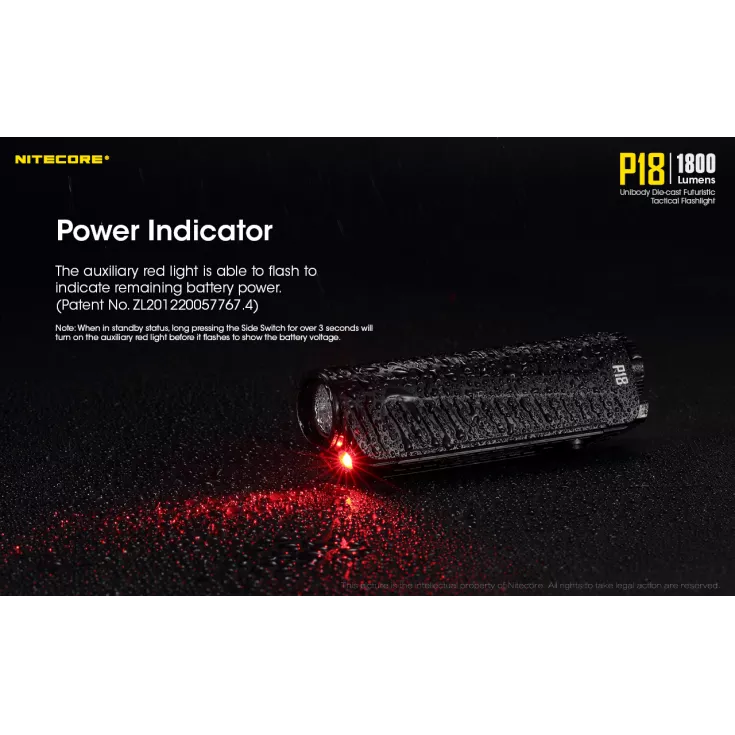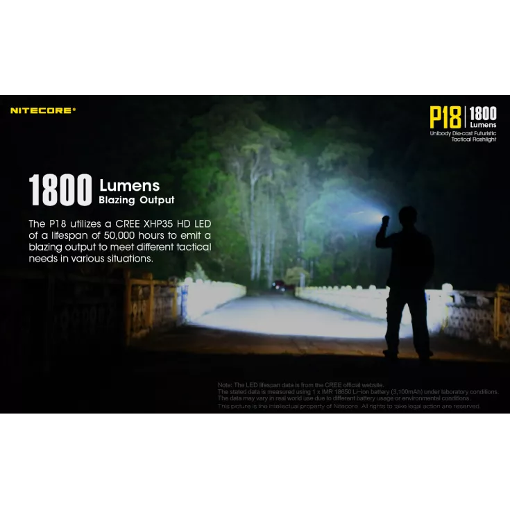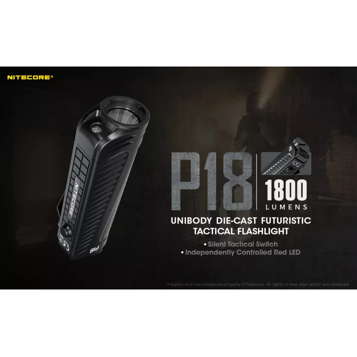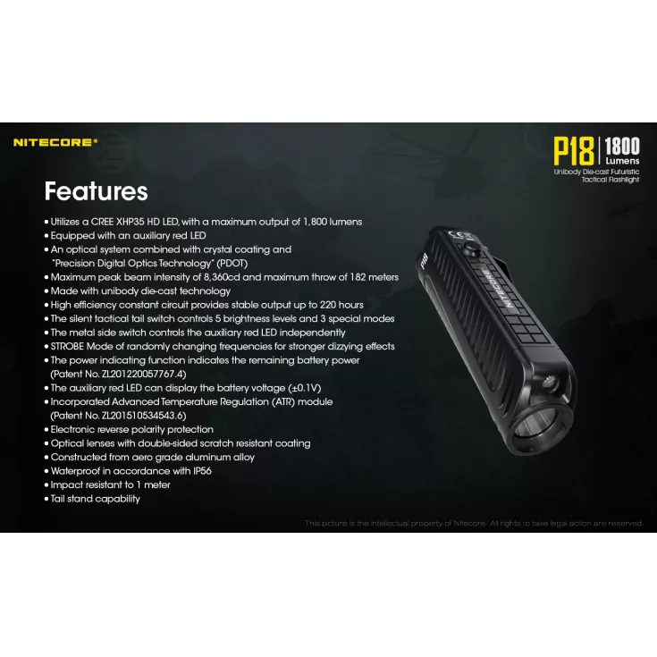 The Nitecore P18 is a tactical, unibody, die-cast torch offering a maximum output of 1800 lumens of white light from the Cree XHP35 HD and 10 lumens of red light from the auxiliary red LED. The flashlight is powered by a single IMR 18650 battery which comes included.