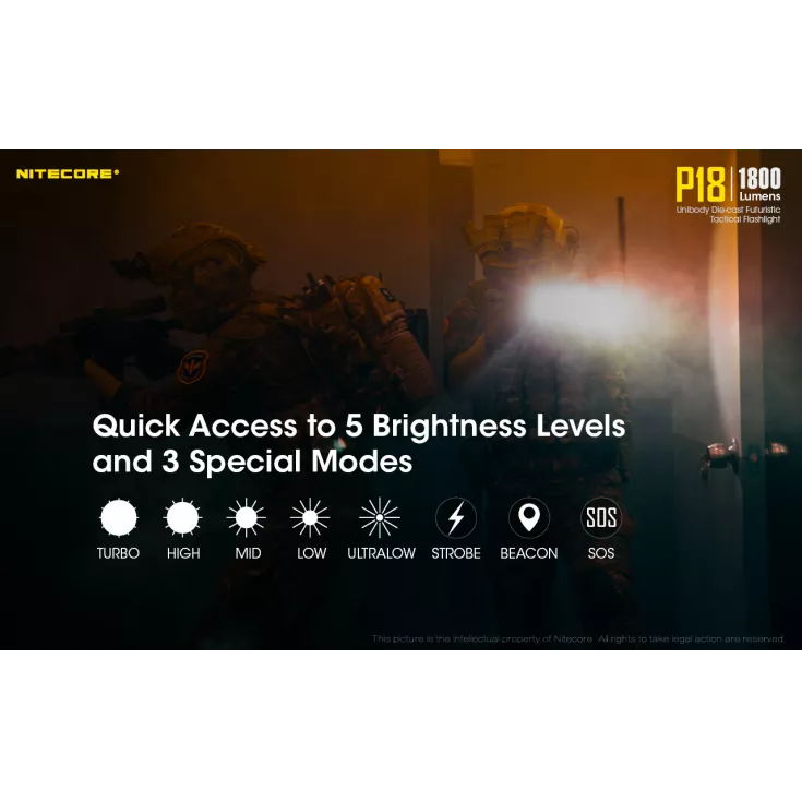 The P18 flashlight is designed for tactical use which can be seen in the rigid, impact resistant body, silent tail switch and auxiliary red light for effectively protecting night vision. The torch can be operated using one hand and offers quick access to the five brightness levels and three special modes, ranging from 1 to 1800 lumens. One of the special outputs, the strobe, is randomly changing which makes the strong dizzying impact more effective.Â