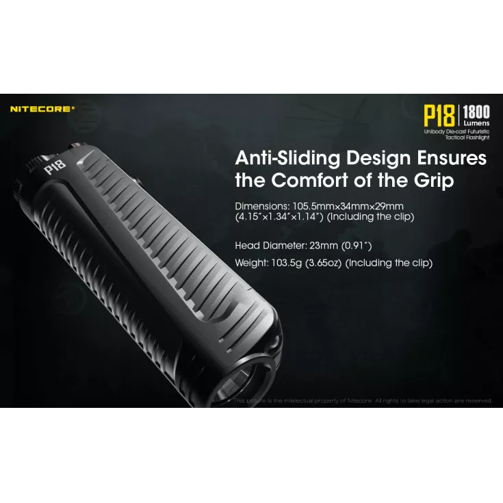 The Nitecore light comes with a detachable pocket clip which makes the P18 easy to carry and store when not in use. The futuristic look incorporated an anti-sliding design for stability and comfortable grip.