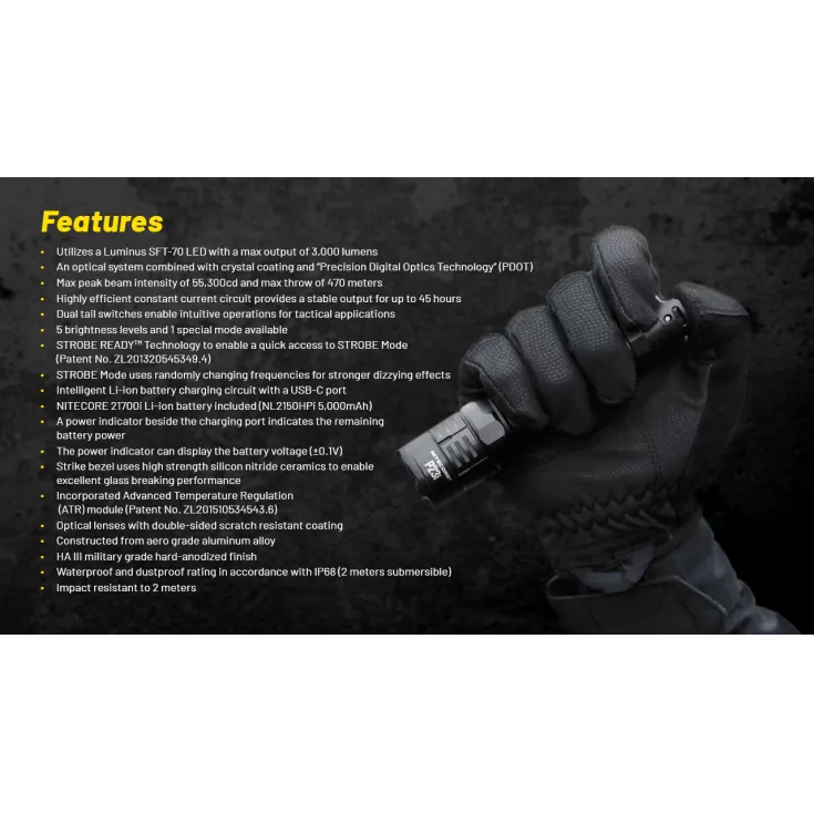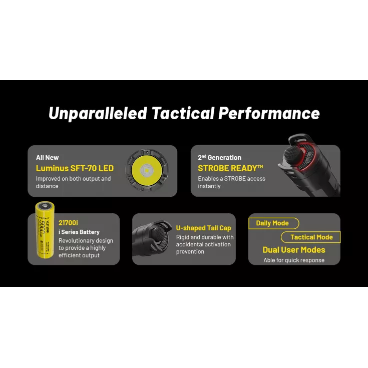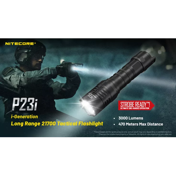 The Nitecore P23i tactical flashlight features an all new Luminus SFT-70 LED for improved brightness and long range lighting. The torch boasts an impressive output of 3000 lumens and a maximum beam distance of 470 meters.Â