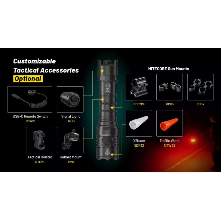 The P23i is compatible with a range of Nitecore accessories including the RSW2i remote switch, TSL10i signal light tail cap, NDF32 diffuser and NTW red traffic wand, all available separately.Â