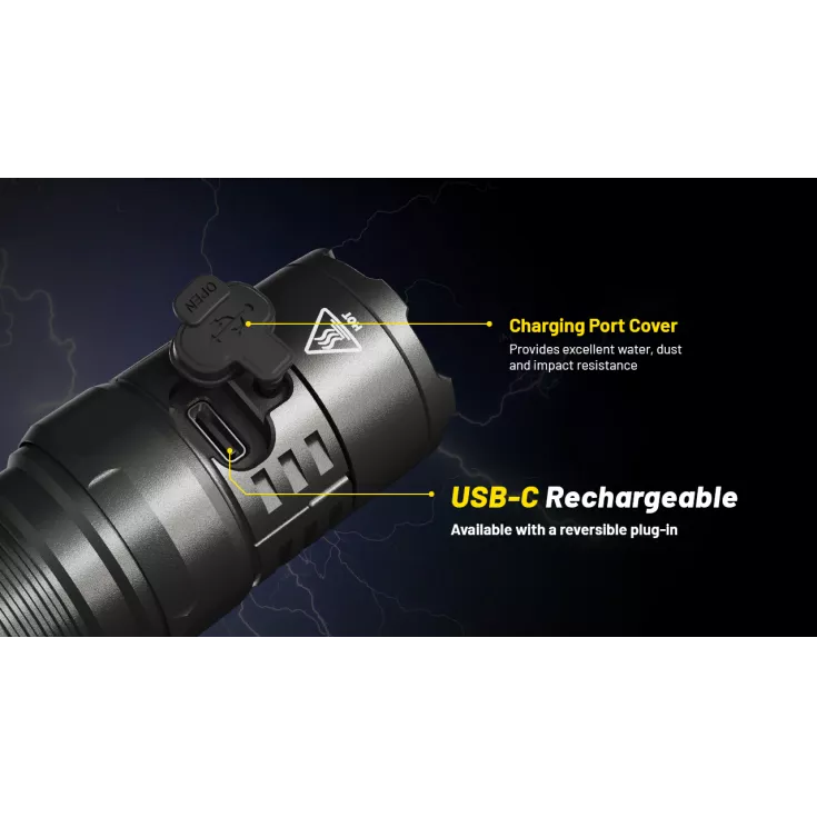 Each P23i includes a high capacity NL2150HPi 5000mAh 21700 Li-ion battery, which charges inside the torch via the USB-C port on the side of the lights head. A USB-C charging lead is also included. When the battery is inserted a blue indicator light displays the battery voltage as a series of flashes.