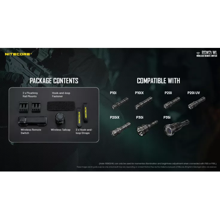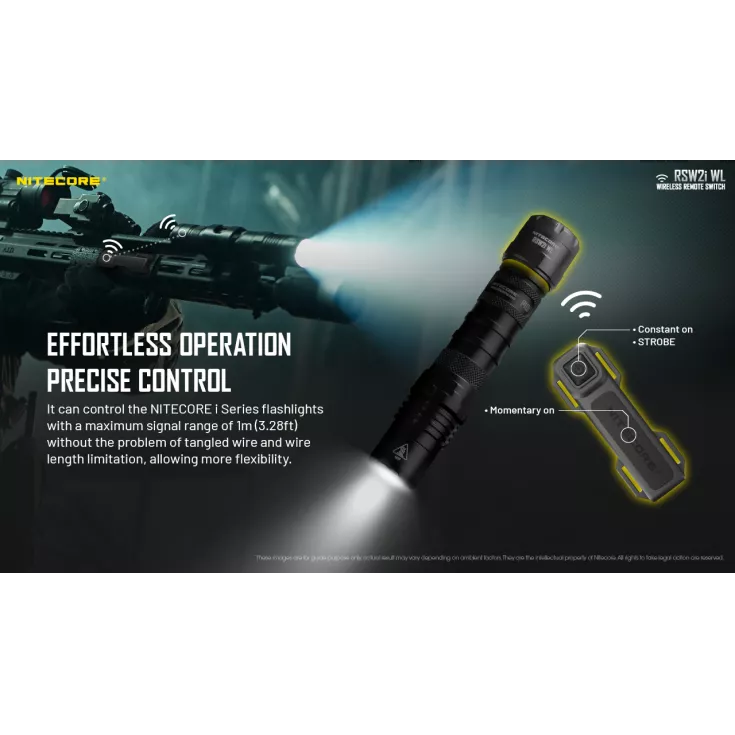 The Nitecore RSW2i WL is a wireless remote switch with a maximum signal range of 1 meter. With effortless operation and precise control, the remote switch can control the Nitecore i series flashlights without the problem of tangled wires and wire length limitation, allowing more flexibility and convenience.Â