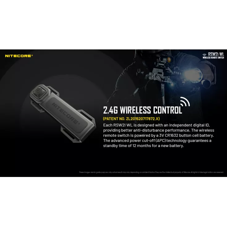 Each RSW2i WL is designed with an independent digital ID creating an undisturbed performance. The switch comes with multiple tactical accessories making it versatile and able to meet all your needs. It is powered by a 3V CR1632 button cell battery, lasting approximately 12 months due to the the advanced power cut-off (APC) technology.Â